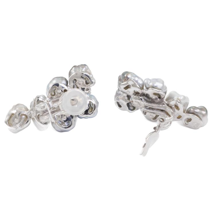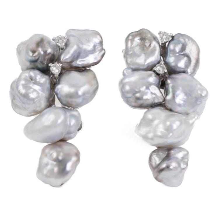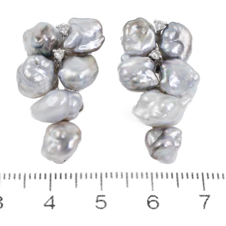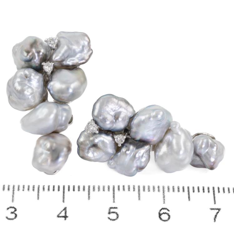 Pearl and Diamond clip-on earrings (for non pierced ears) with 12 Baroque Cultured Pearls of size 10.9 x 6.2mm - 7.1 x 7.2mm and round natural Diamonds totalling 0.12cts. Platinum-900 With 9ct white gold backs (XRF tested, stamped Pt900). Weight: 14.7g. (Pre-owned)