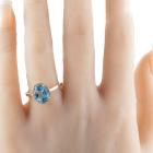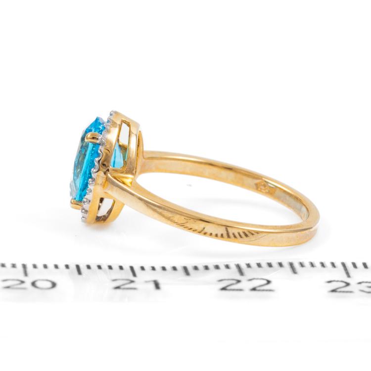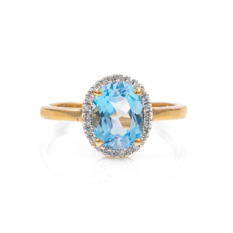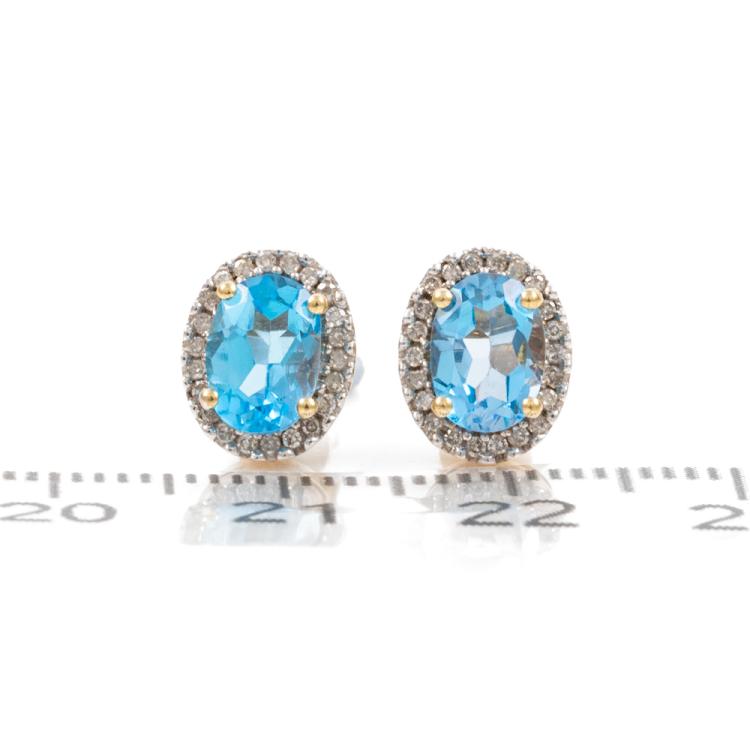Two piece Topaz set: incl. 1) Blue Topaz ring with oval natural blue Topaz of approximately 2.00ct & round natural Diamonds totalling 0.10ct, ring size N1/2, band width: 1.8mm. 2) Topaz earrings with oval natural blue Topaz totalling approximately 1.70ct & round natural Diamonds of 0.15ct. Both 9ct yellow gold with rhodium plated claws. Combined weight: 6.3g. (As new)^