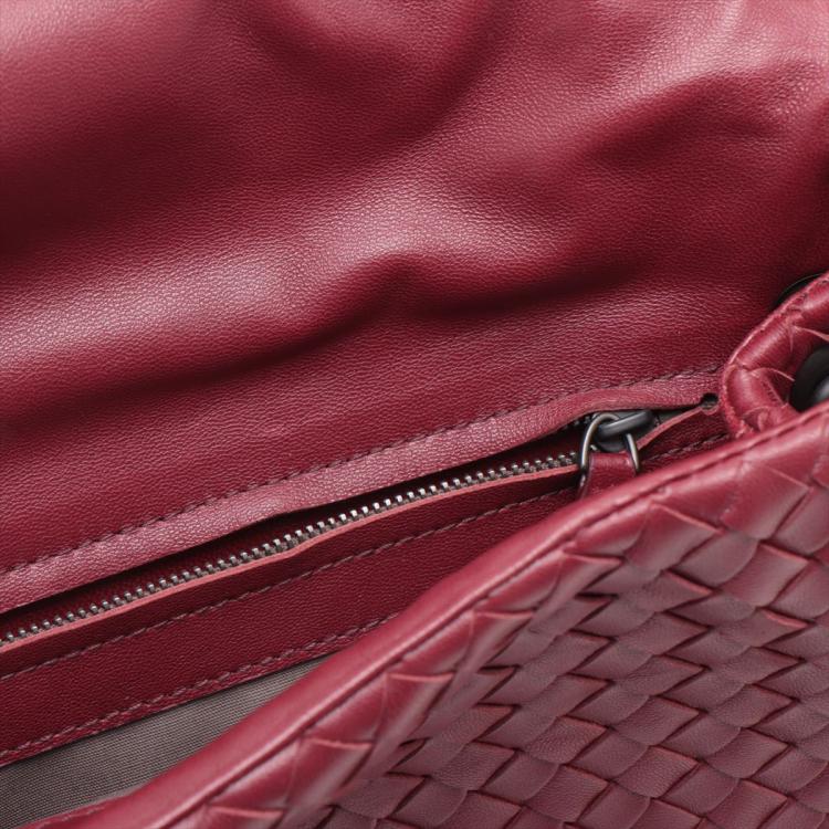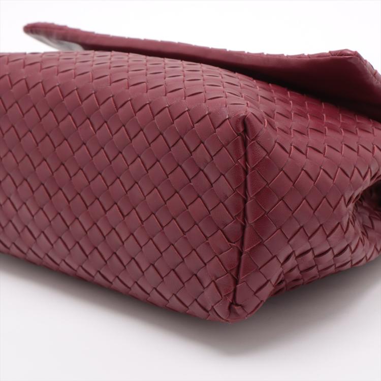 Bottega Veneta shoulder bag in Intrecciato leather in bordeaux colour. Featuring metal tone hardware, flip-over flap with magnetic closure at front. The flap opens to a grey fabric lining interior with zipped and patch pocket. Approximate dimensions: 28cm(L) x 23cm(H) x 11cm(D) and 61cm adjustable shoulder strap height. With Entrupy Certificate of Authenticity. (Pre-owned)