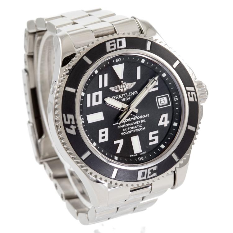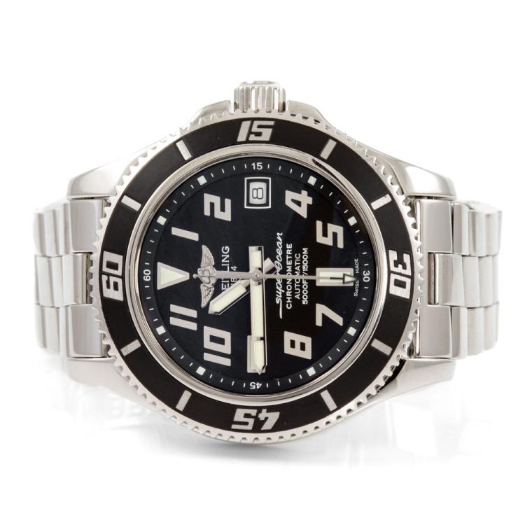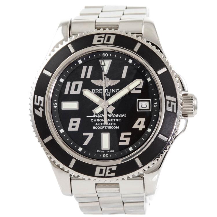 Breitling Superocean stainless steel automatic mens watch. Black dial, date, case diameter: 42mm, wrist size: 16.5cm, Swiss made. Ref #A17364. With Breitling stainless steel bracelet & clasp. With Certificate of Authenticity, Undated Breitling international warranty booklet and Breitling box. 3 month warranty. (Pre-owned)