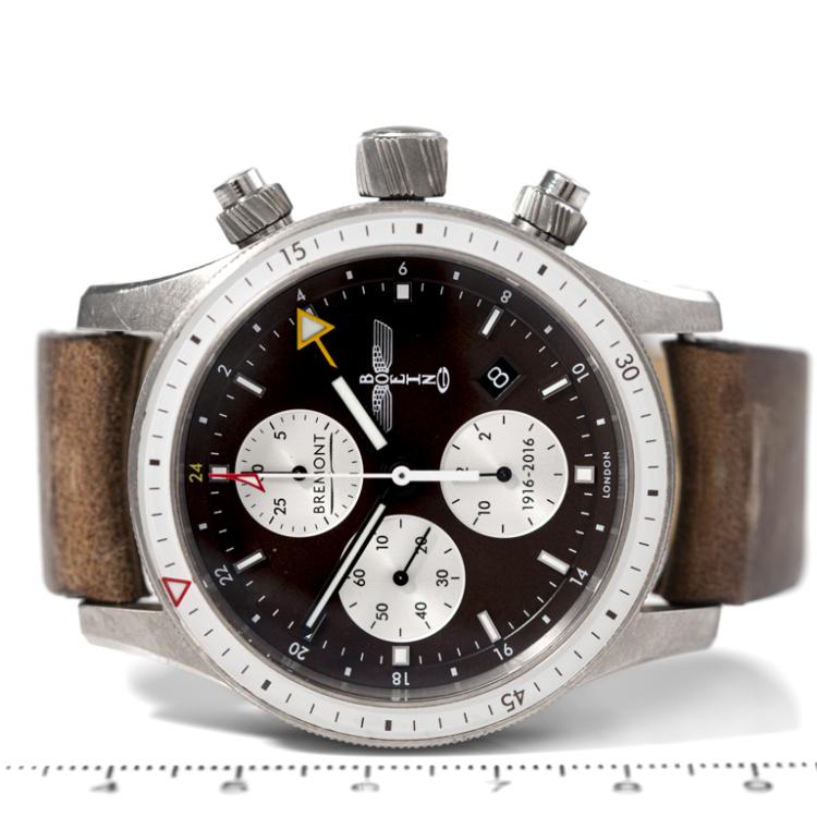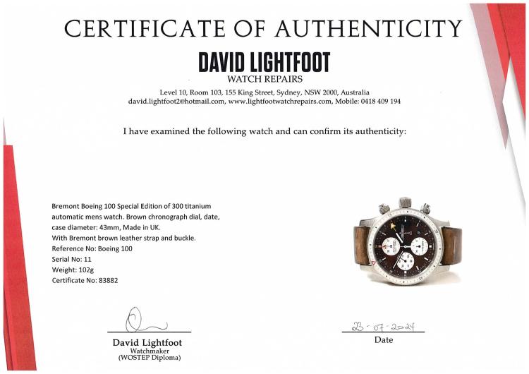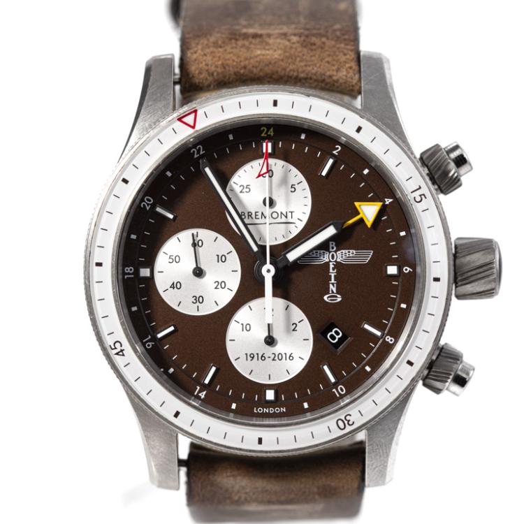 Bremont Boeing 100 Special Edition of 300 titanium automatic mens watch. Brown chronograph dial, date, case diameter: 43mm, strap length: 20.5cm, Made in UK. Ref# Boeing 100. With Bremont brown leather strap and buckle. With Certificate of Authenticity, Bremont COSC & Warranty Registration booklet dated 03/09/2016 and Bremont box. 3 month FSA warranty (Pre-owned)