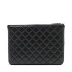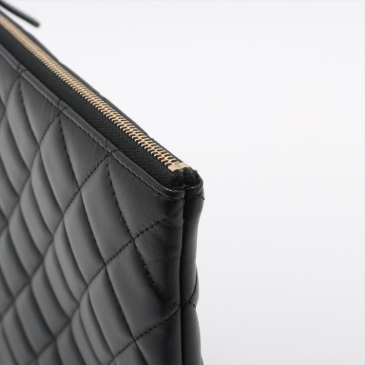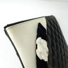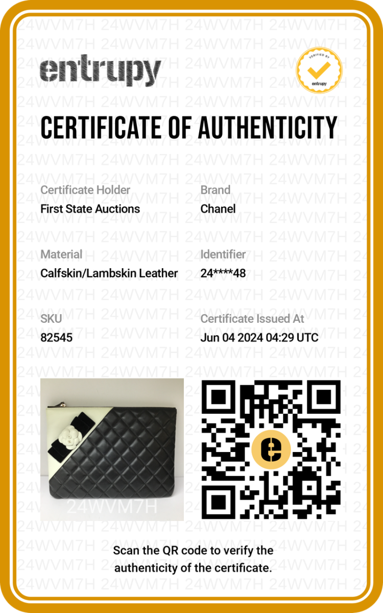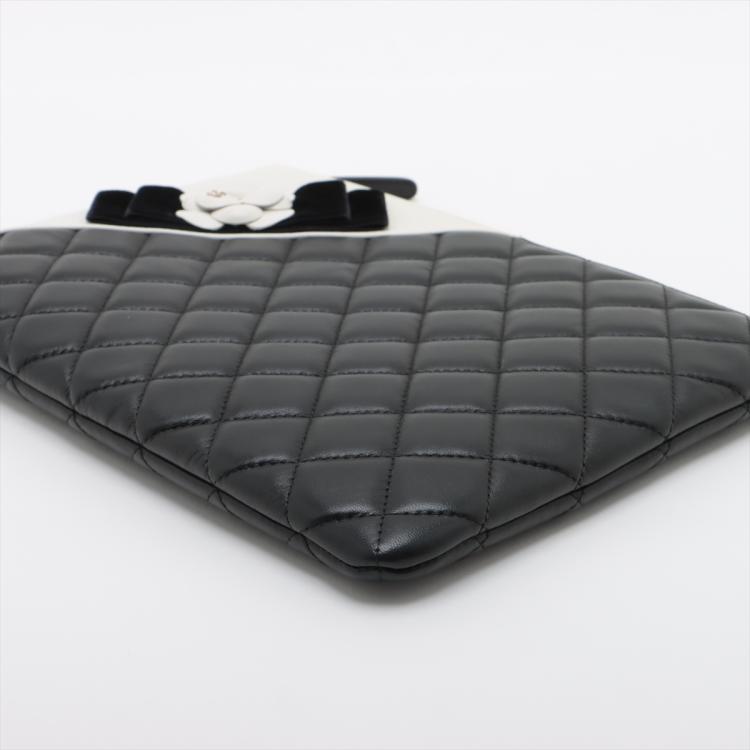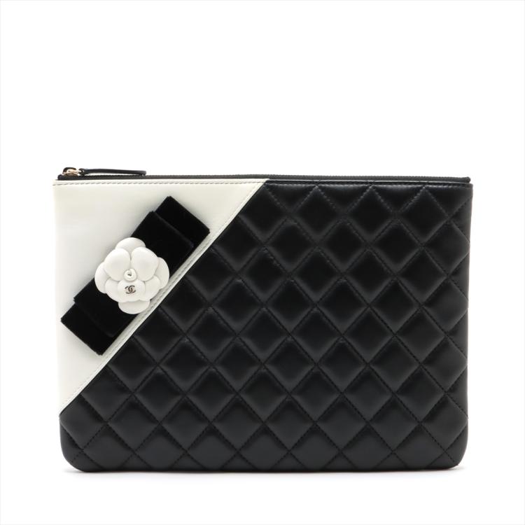 Chanel Camelia O-Case clutch in black & white diamond quilted lambskin. Featuring light gold tone hardware, Camellia and Bow details at front. The zipper closure opens to a black padded nylon lining interior. Approximate dimensions: 27.5cm(L) x 19.5cm(H) x 2cm(D). Accompanied by Chanel certificate card, dust bag and box. With Entrupy Certificate of Authenticity. (Pre-owned)