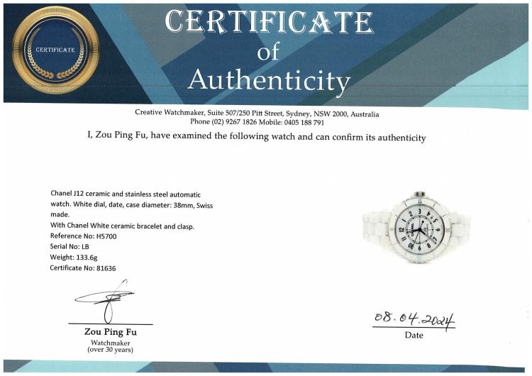 Chanel J12 ceramic and stainless steel automatic watch. White dial, date, case diameter: 38mm, wrist size: 17cm, Swiss made. Ref# H5700. With Chanel White ceramic bracelet and clasp. With Certificate of Authenticity, Chanel International Warranty card dated 18/07/2022 and Chanel box. Balance of 5 year Chanel manufacturer warranty applies. (Pre-owned)
