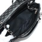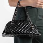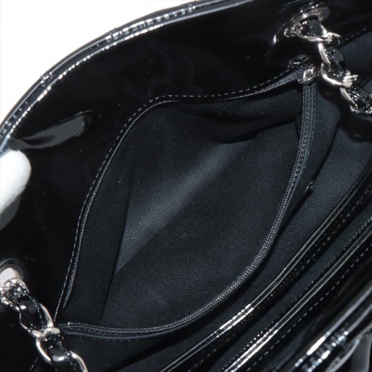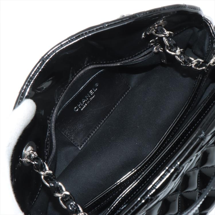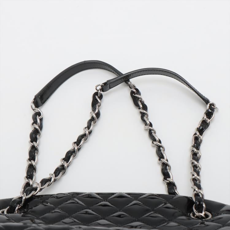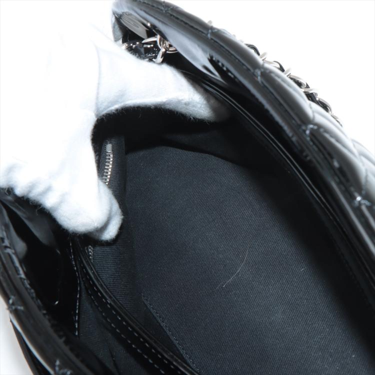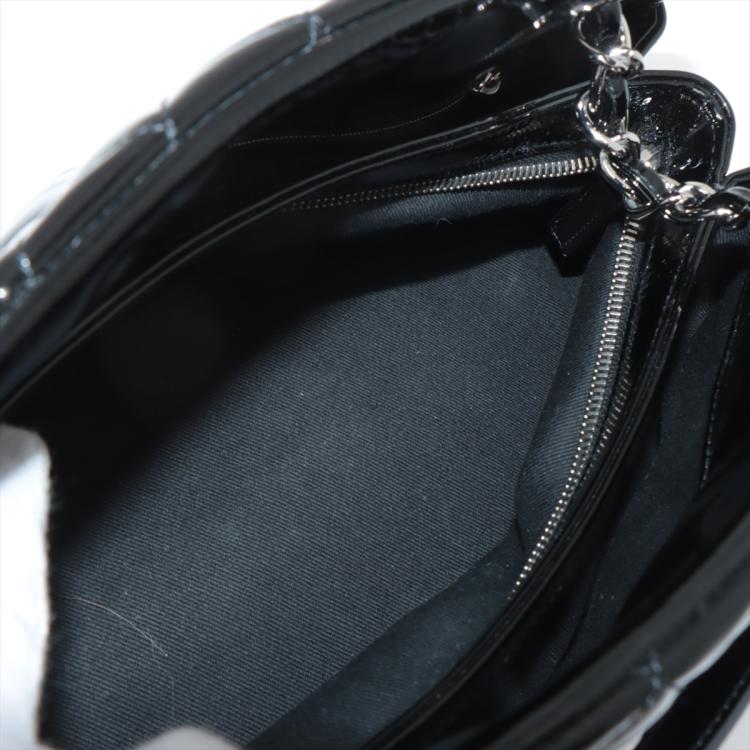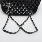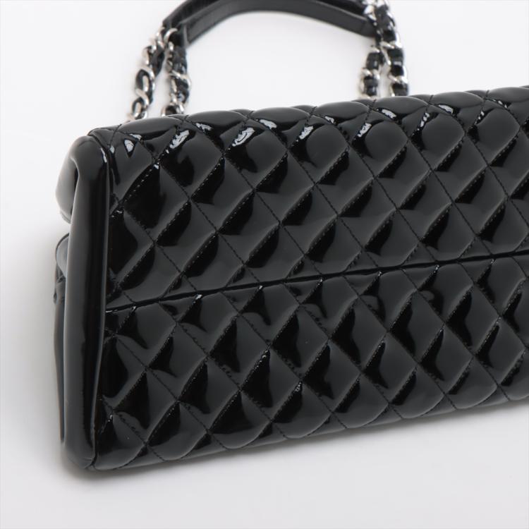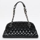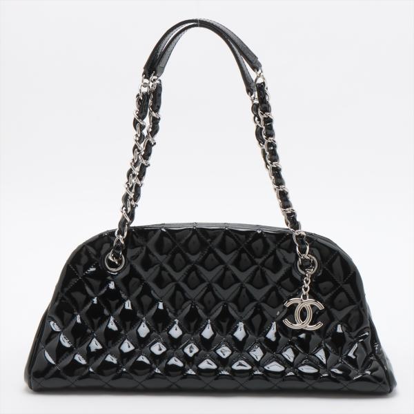 Chanel Just Mademoiselle bowling bag in black patent, diamond quilted leather. Featuring silver-toned hardware, a Chanel CC pendant on front. The top opens to a black fabric lining interior with 3 compartments, middle one with zipper closure. Approximate dimensions: 33cm(L) x 16.5cm(H) x 15m(D), 17cm double leather-chain strap. Accompanied by Chanel certificate card, info cards. With Entrupy Certificate of Authenticity. (Pre-owned)