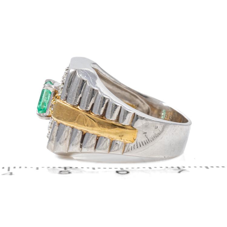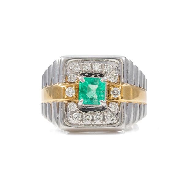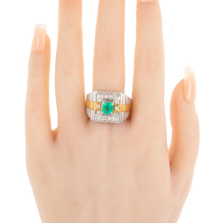 Emerald and Diamond ring with square emerald cut Natural Emerald of 0.86ct and round Natural Diamonds totalling 0.49ct (Estimated grading: H-I SI). Platinum 900 and 18ct yellow gold. Ring size U. Band width: 5.9mm - 10.3mm. Weight: 23.0g. (Pre-owned)