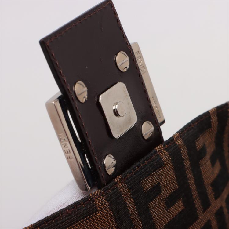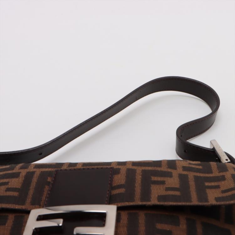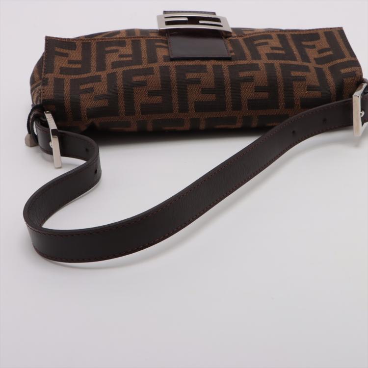 Fendi Baguette shoulder bag in Zucca canvas in brown. Featuring a dark chocolate brown leather looping shoulder strap and facing flap with FF logo detail, silver tone hardware. The magnetic button closure opens to a brown fabric interior with a zipper pocket. Approximate dimensions: 25.5cm(L) x 14cm(H) x 4cm(D), 19cm handle drop. Accompanied by a Fendi dust bag. With Entrupy Certificate of Authenticity. (Pre-owned)