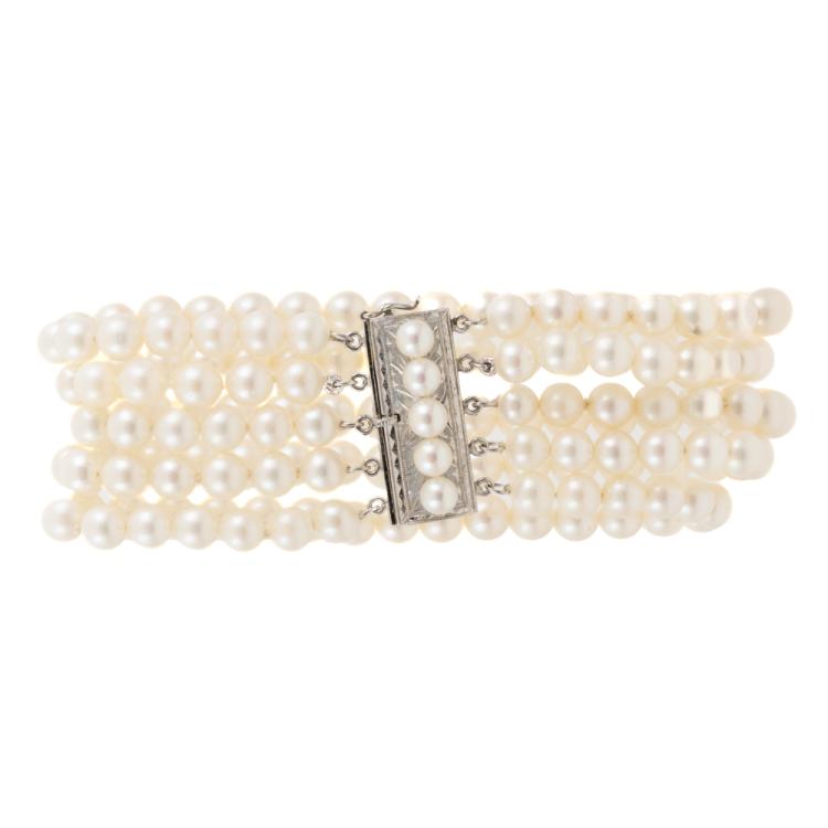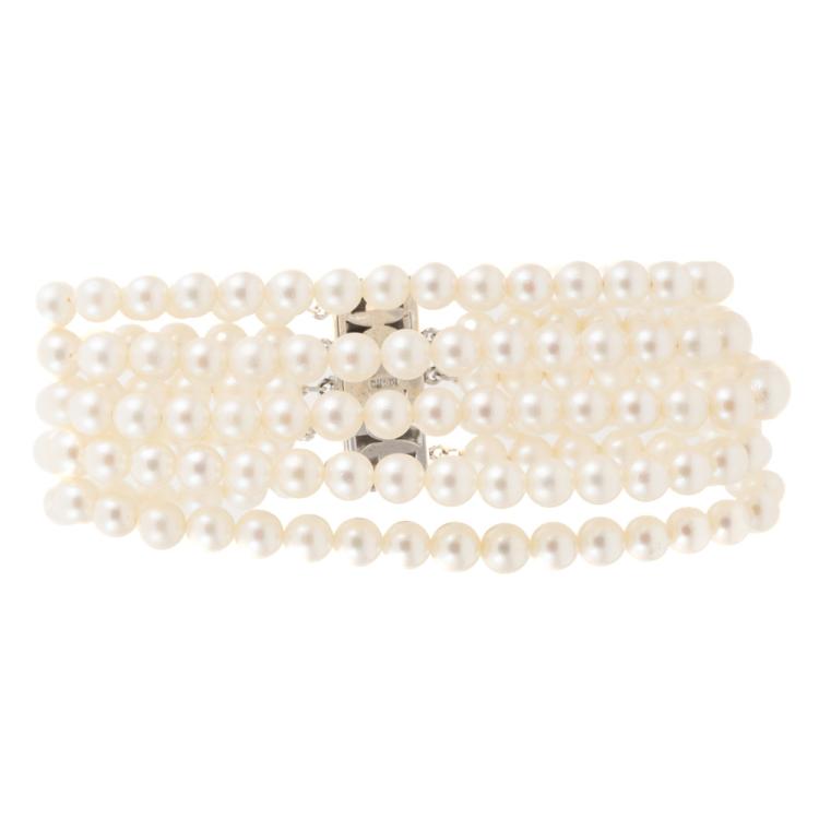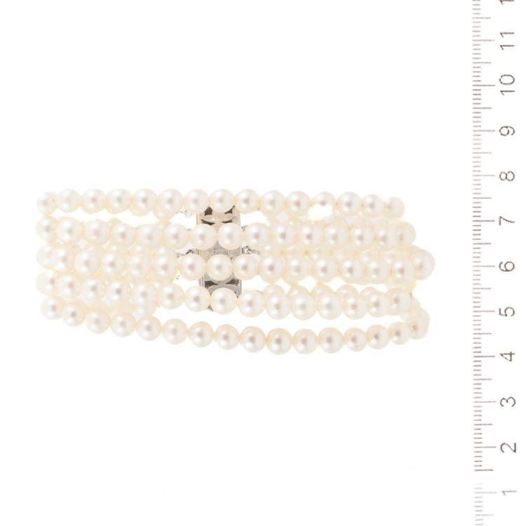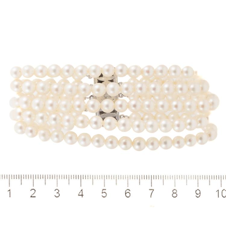Pearl bracelet with 5-row Akoya Pearls of 5.3 - 5.8mm. 14ct white gold clasp set with 5 Akoya Pearls of 4.7mm. Length: 17.5cm. Weight: 45.3g. (Pre-owned)
