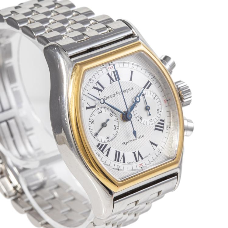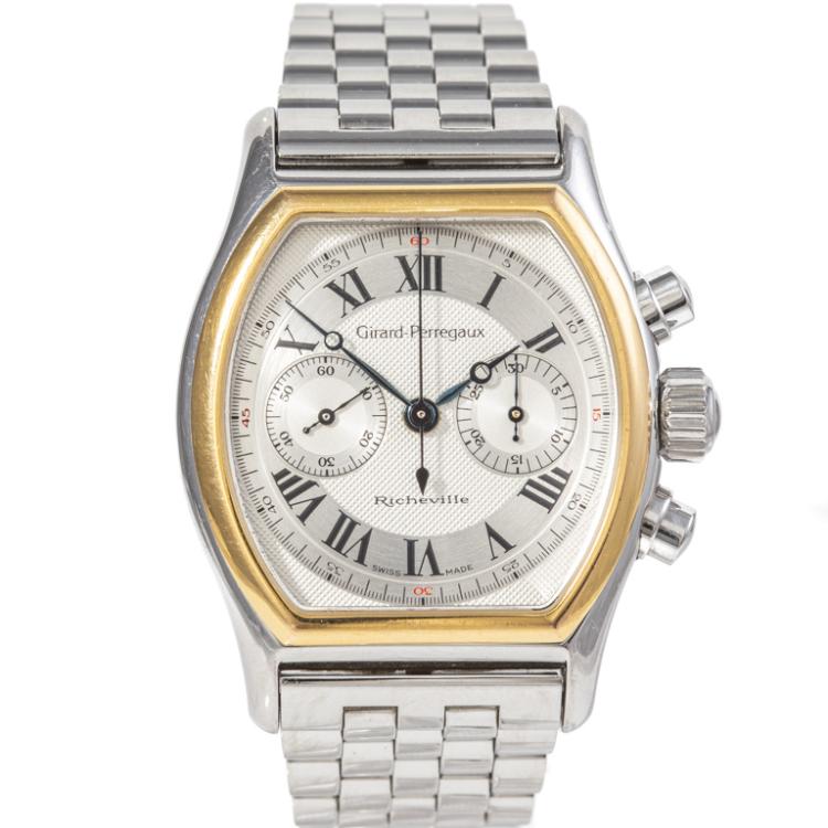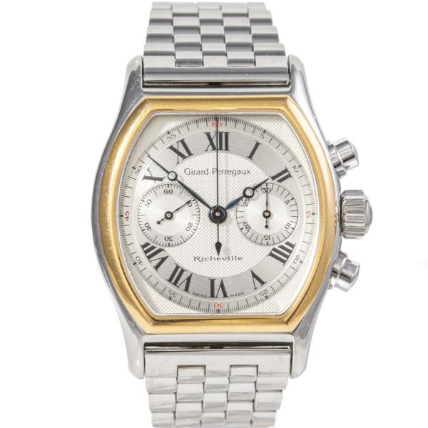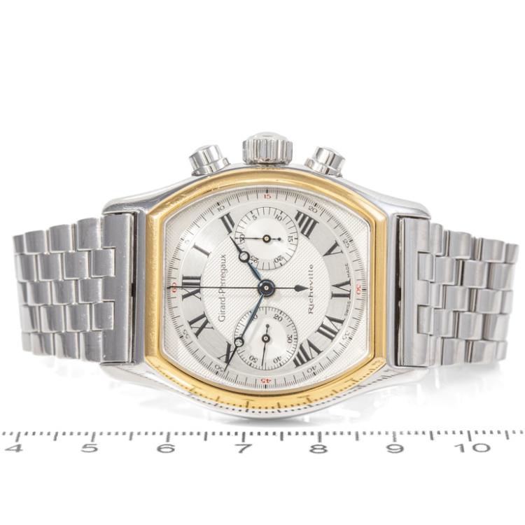 Girard-Perregaux Richeville 18ct yellow gold and stainless steel manual winding mens watch. Silver chronograph dial, case diameter: 45mm x 35mm, wrist size: 17cm, Swiss made. Ref# 2710. With Girard-Perregaux stainless steel bracelet and clasp. With Certificate of Authenticity. 3 month FSA warranty. (Pre-owned)