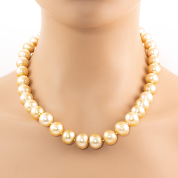 Pearl necklace with 36 graduated button shape Golden South Sea Pearls of 13.6mm-11.3mm. 14ct yellow gold 12mm ball clasp. Length: 46.5cm. Weight: 96.7g. With Certificate #418894. (Pre-owned)