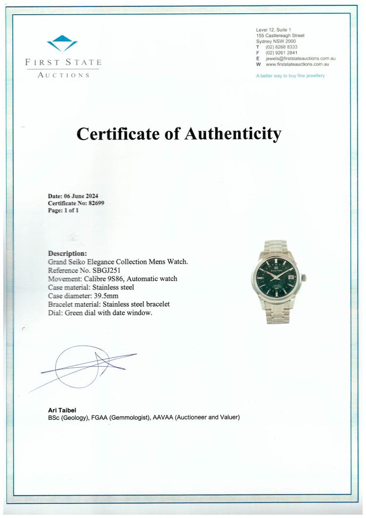 Grand Seiko Elegance Collection stainless steel automatic mens watch. Green dial, date, case diameter: 39.5mm, wrist size: 19cm, Made in Japan. Ref# SBGJ251. With Grand Seiko stainless steel bracelet and clasp. With FSA Certificate of Authenticity and Grand Seiko box. 3 month FSA warranty (As new, Note: minor scuff on case and bracelet due to being display stock)