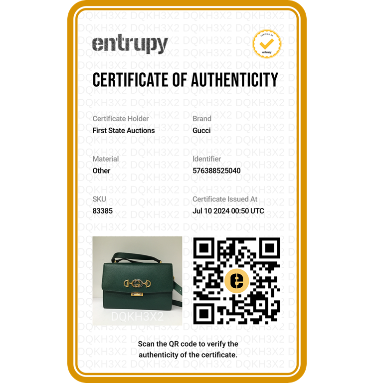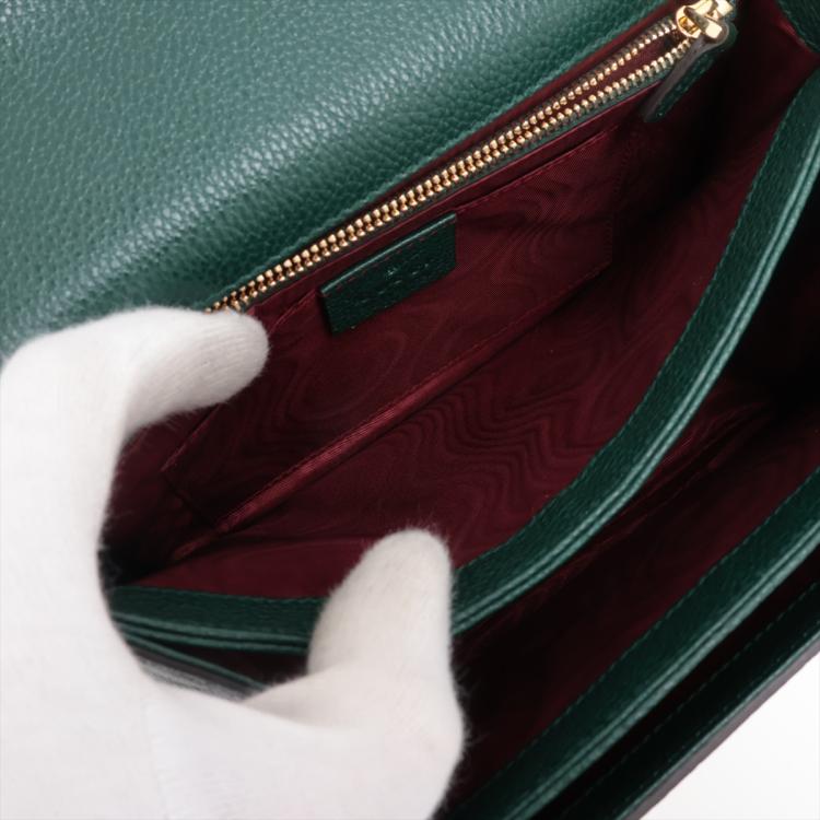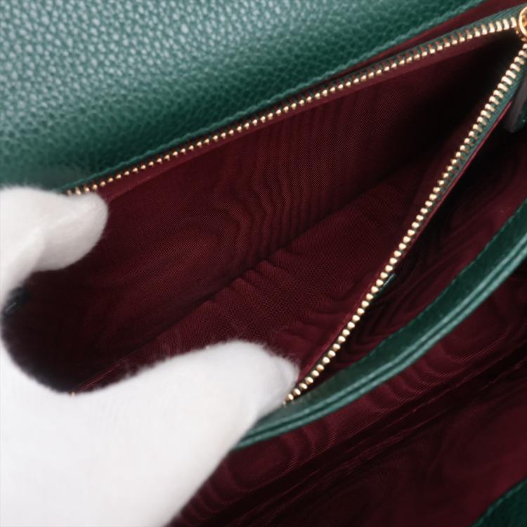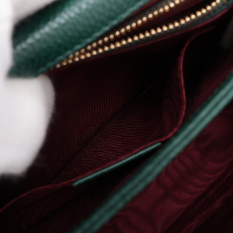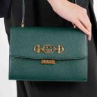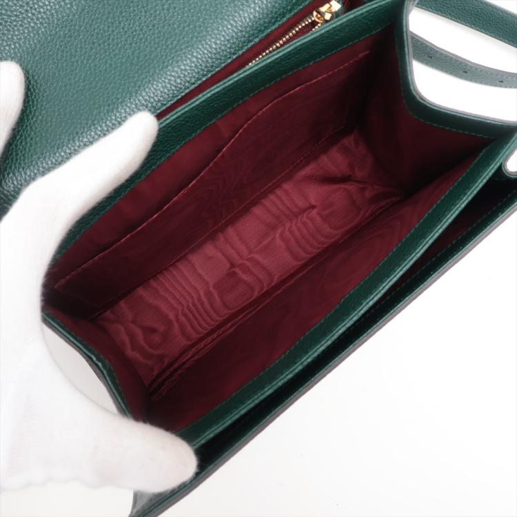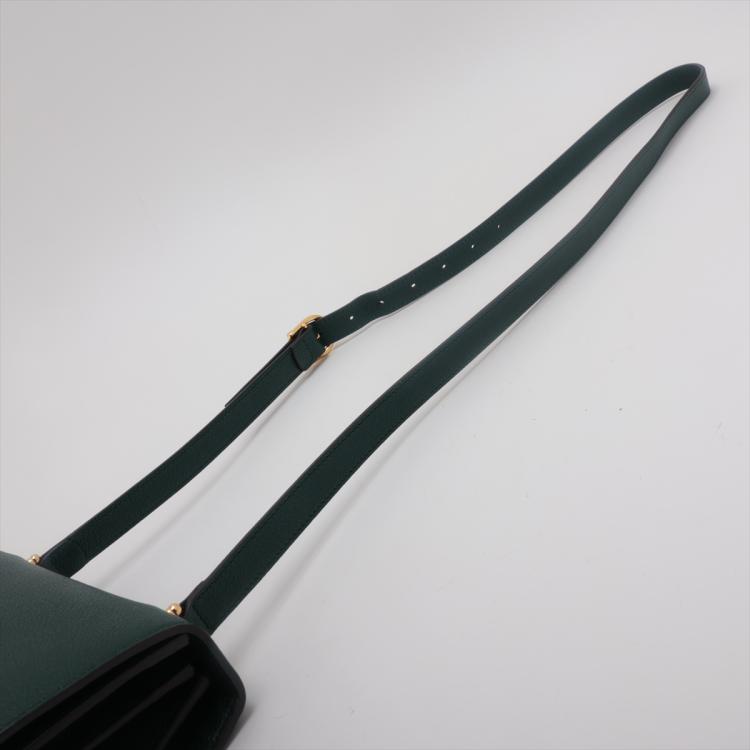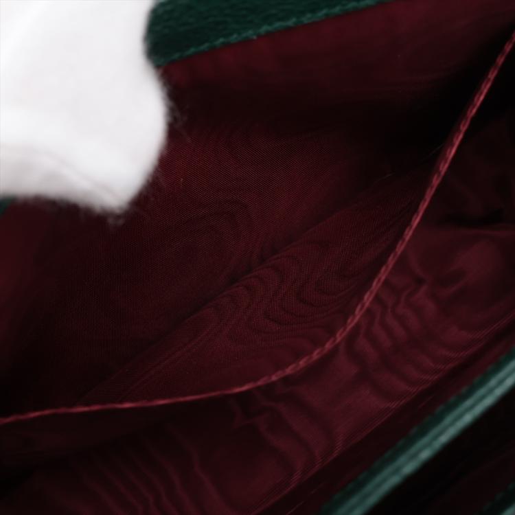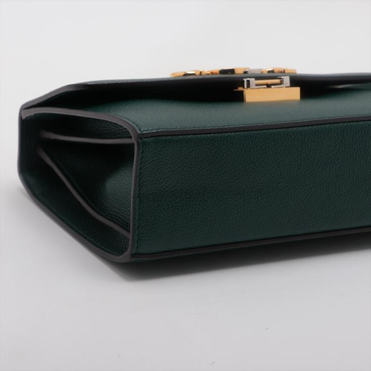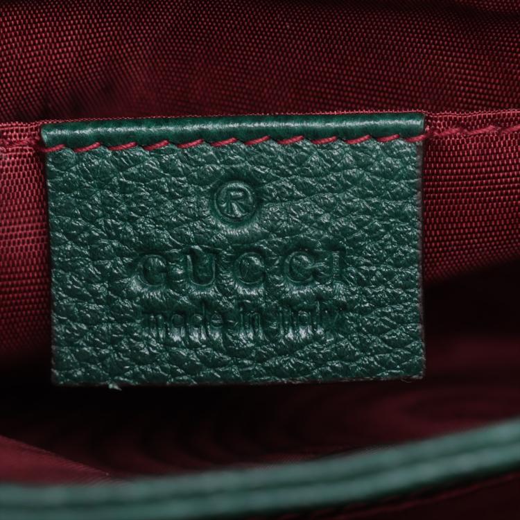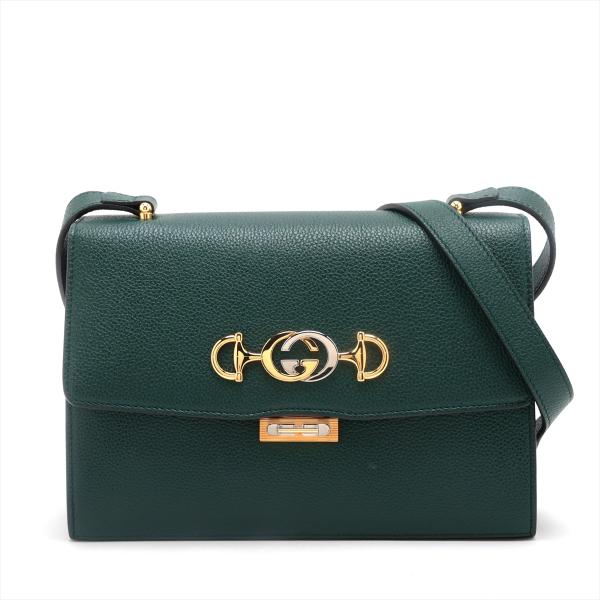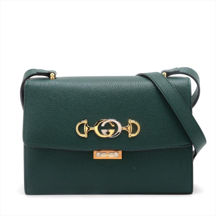 Gucci small Zumi shoulder bag in green calfskin leather. Featuring gold & silver toned hardware, interlocking G hoursebit logo on front flap. The flap with push-lock closure opens to a dark red nylon lining interior with 3 compartments with patched & zipped pockets. Approximate dimensions: 24cm(L) x 15.5cm(H) x 8cm(D), adjustable strap drop: 58cm. Accompanied by a Gucci box, dustbag, and cards. With Entrupy Certificate of Authenticity. (Pre-owned)