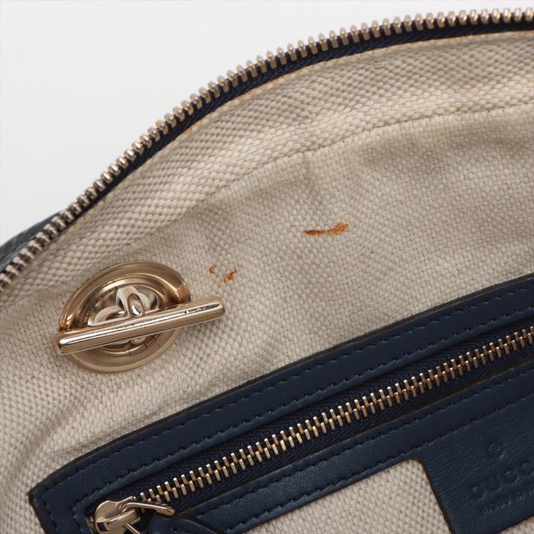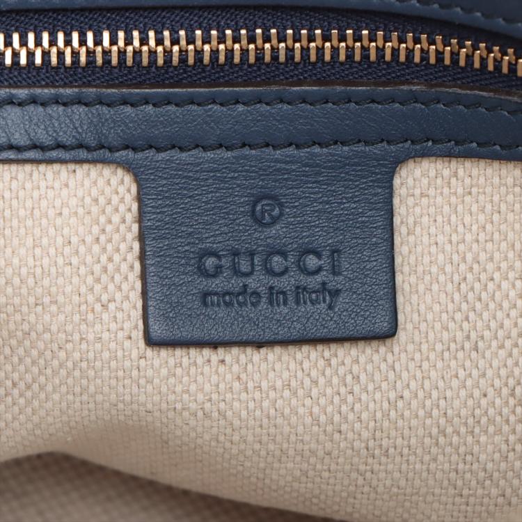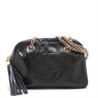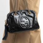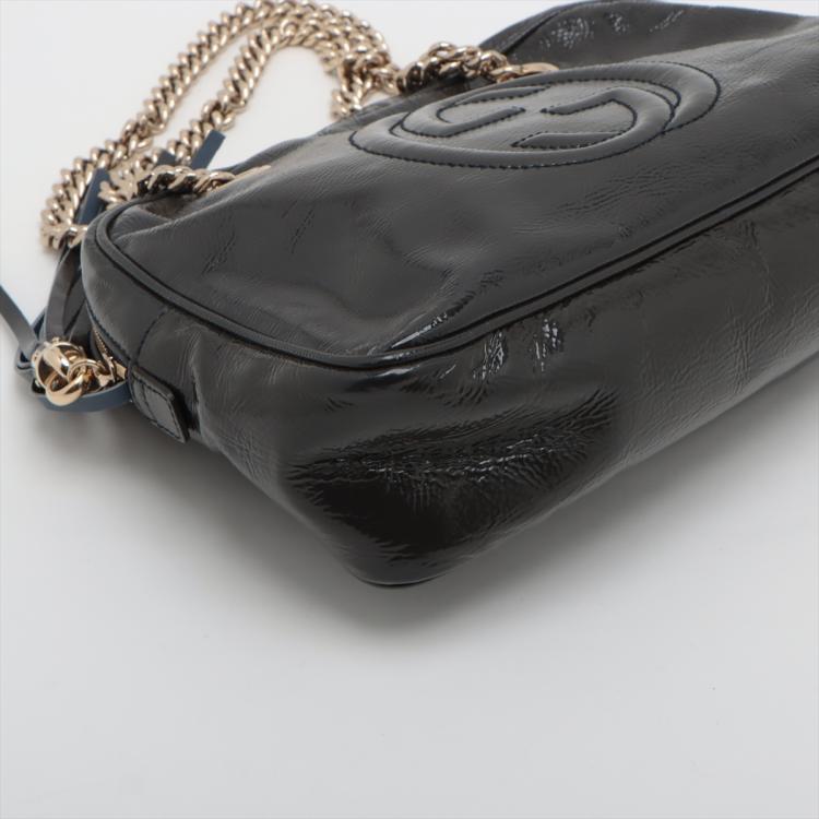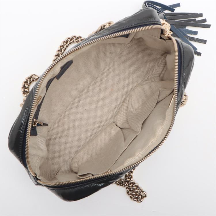 Gucci Soho chain shoulder bag in navy blue to grey patent leather. Featuring a large stitched frontal GG logo, light gold tone hardware, a gold tipped tassel as zipper puller. This opens to a natural linen interior with zipped and patch pockets. Approximate dimensions: 28cm(L) x 17.5cm(H) x 8cm(D), 24cm double gold chain drop height. Accompanied by a Gucci dust bag. With Entrupy Certificate of Authenticity. (Pre-owned)