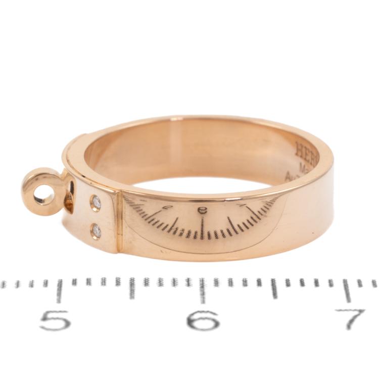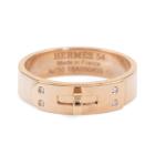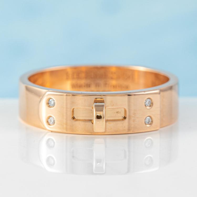 Hermes Kelly ring, small model with 4 round Natural Diamonds totalling 0.02ct. 18ct rose gold. Hermes stamped size 54, actual ring size N - ring resizing is not recommended. Width: 5mm. Made in France. Weight: 5.8g. (Pre-owned)