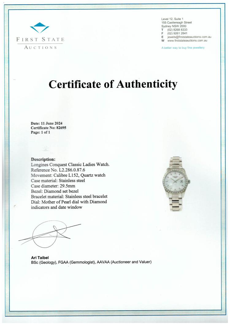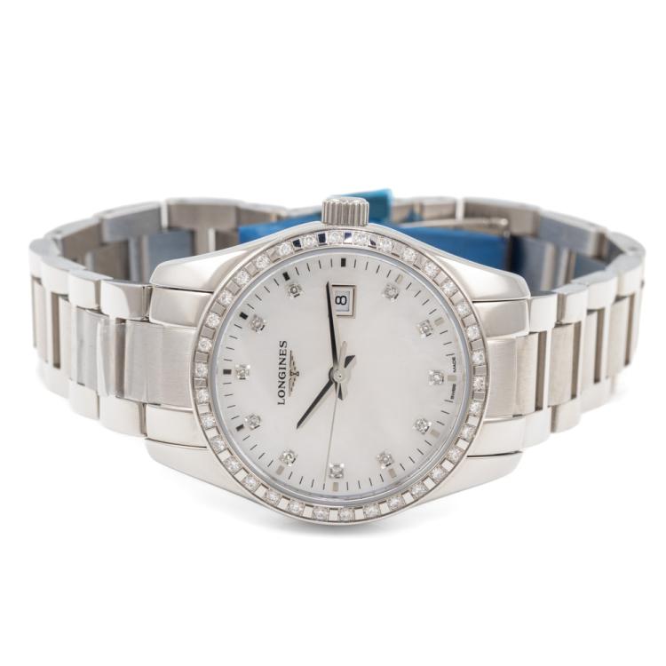 Longines Conquest Classic stainless steel quartz ladies watch. Mother of Pearl dial, Diamond indicators and set bezel, date, case diameter: 29.5cm, Swiss made. Ref# L2.286.0.87.6. With Longines stainless steel bracelet and clasp. With FSA Certificate of Warranty, Longines Diamond Certificate card and Longines box. 3 month FSA warranty (As new, Note: minor scuff and scratches on case and bracelet due to being display stock)