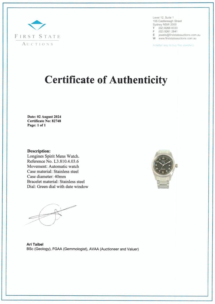 Longines Spirit stainless steel automatic mens watch. Green dial, date, case diameter: 40mm, wrist size: 19.5cm, Swiss made. Ref# L3.810.4.03.6. With Longines stainless steel bracelet and clasp. With FSA Certificate of Authenticity, Longines COSC Certified Chronometer card and Longines box. 3 month FSA warranty (As new, Note: minor scuff on back case due to being display stock)