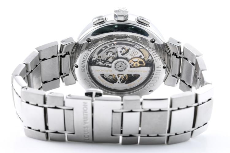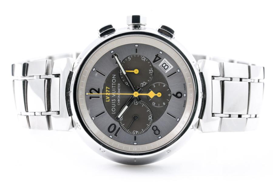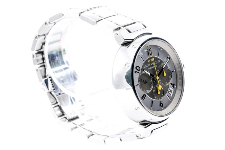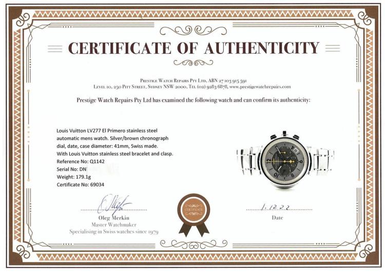 Louis Vuitton LV277 El Primero stainless steel automatic men's watch. Silver/brown chronograph dial, date, case diameter: 41mm, wrist size: 17.5cm, Swiss made. Ref# Q1142. With Louis Vuitton stainless steel bracelet and clasp. With Certificate of Authenticity and Louis Vuitton box. 3 month FSA warranty. (Pre-owned)
