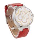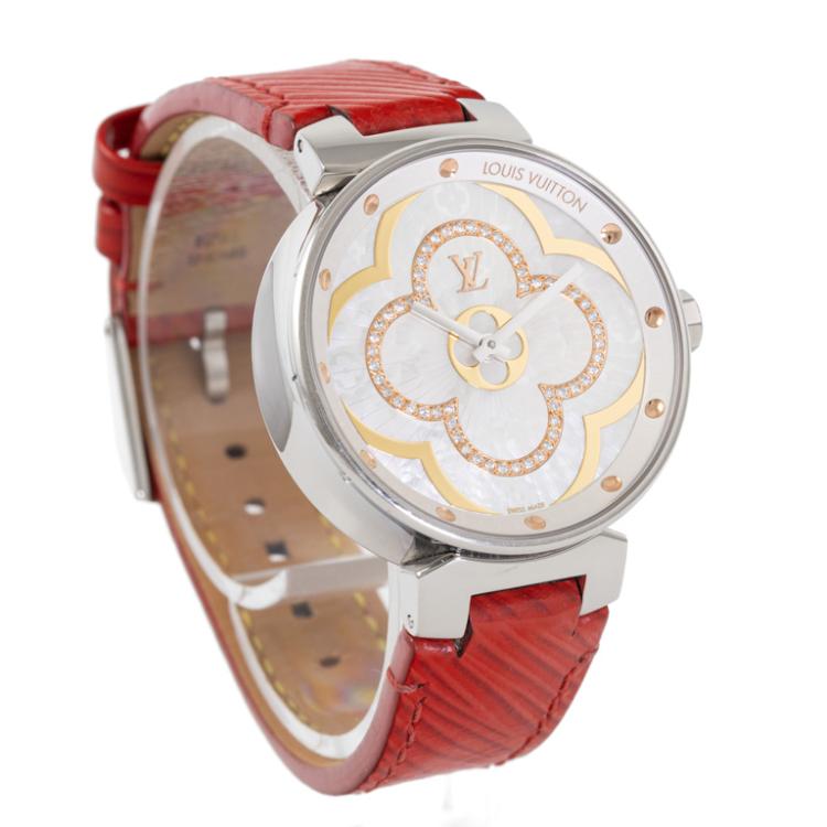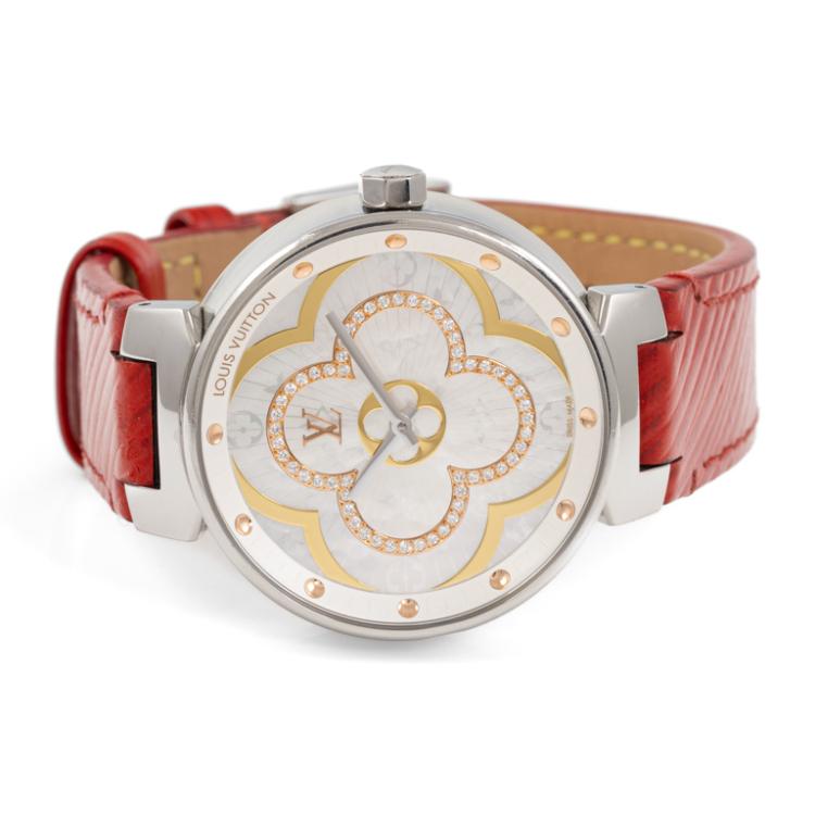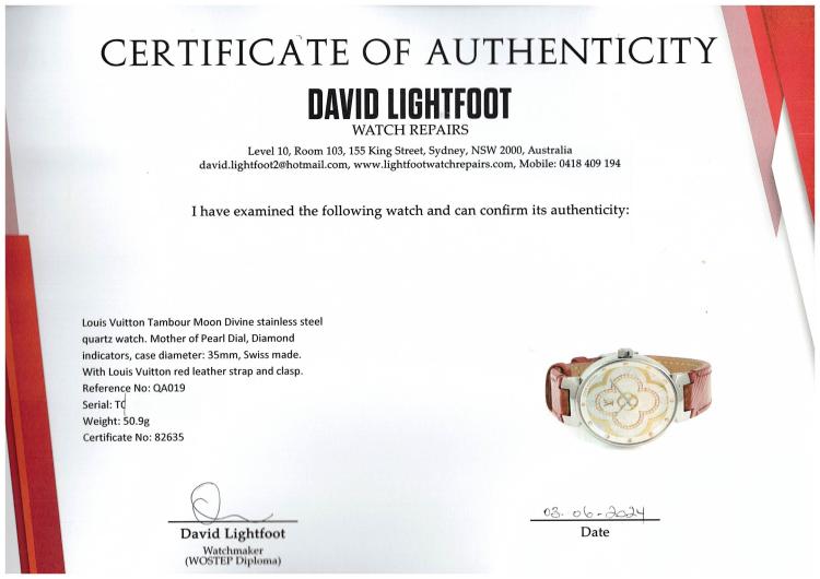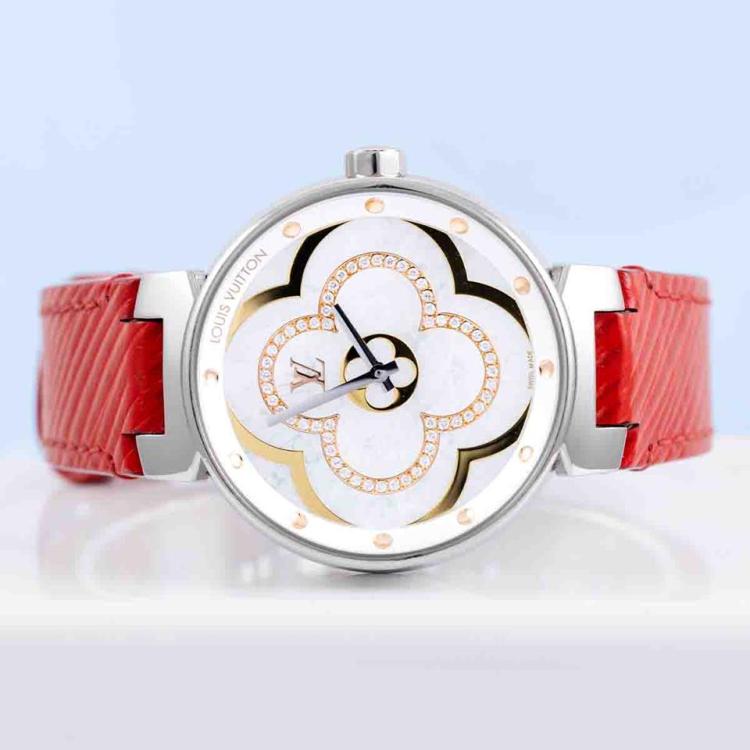 Louis Vuitton Tambour Moon Divine stainless steel ladies quartz watch. Mother of Pearl Dial, Diamond indicators, case diameter: 35mm, strap length: 18cm, Swiss made. Ref# QA019. With Louis Vuitton red leather strap and clasp. With Certificate of Authenticity, Louis Vuitton International Guarantee booklet dated 27/05/2018 and Louis Vuitton box. 3 month FSA warranty. (Pre-owned)