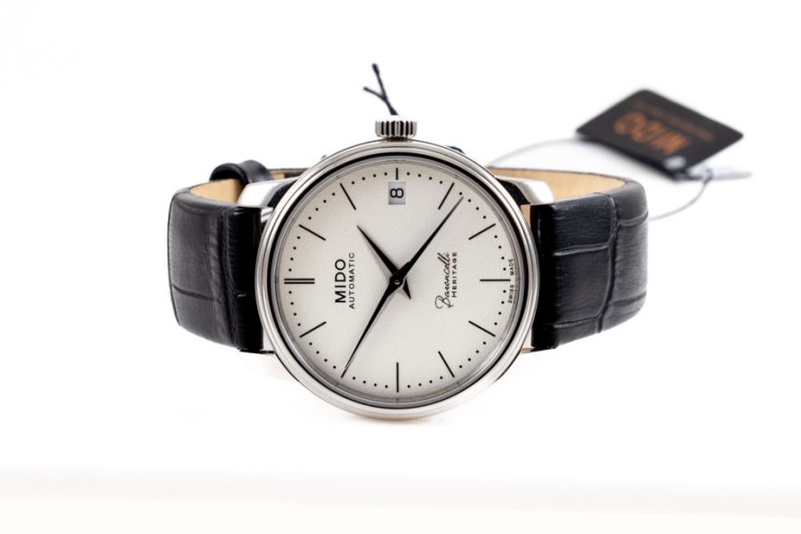 Mido Baroncelli Heritage stainless steel automatic ladies watch. White dial, date, case diameter: 33mm, strap length: 20cm, Swiss made. Ref# M027.207.16.010.00. With Mido black leather strap and buckle. With 2-Year International Warranty Card - the card is not stamped so Mido warranty does not apply. No box provided. 3 month FSA warranty. (As New, NOTE: minor scratches on case and wear on strap due to being display stock)^