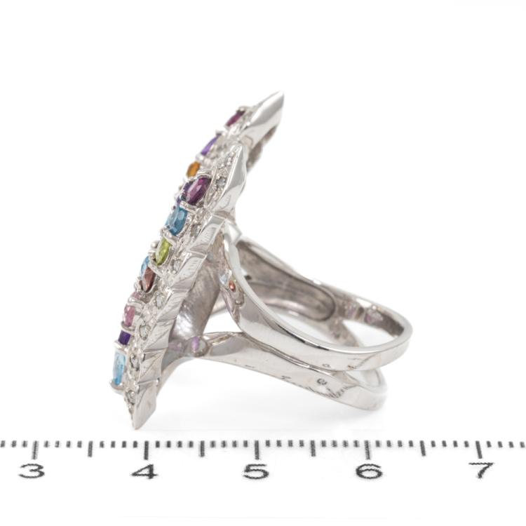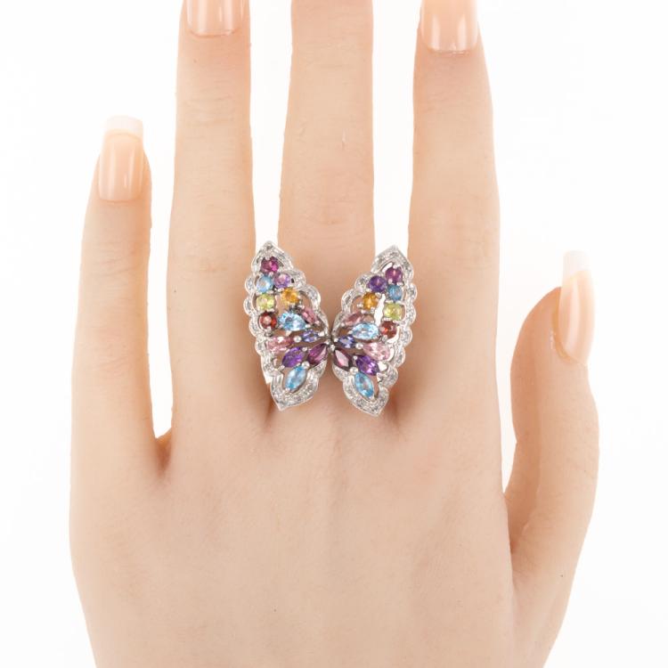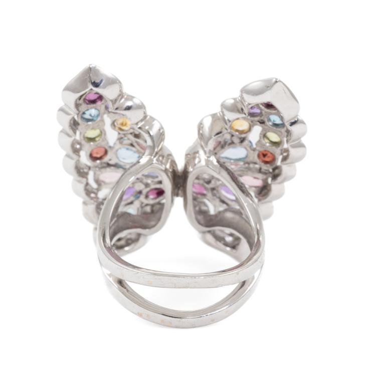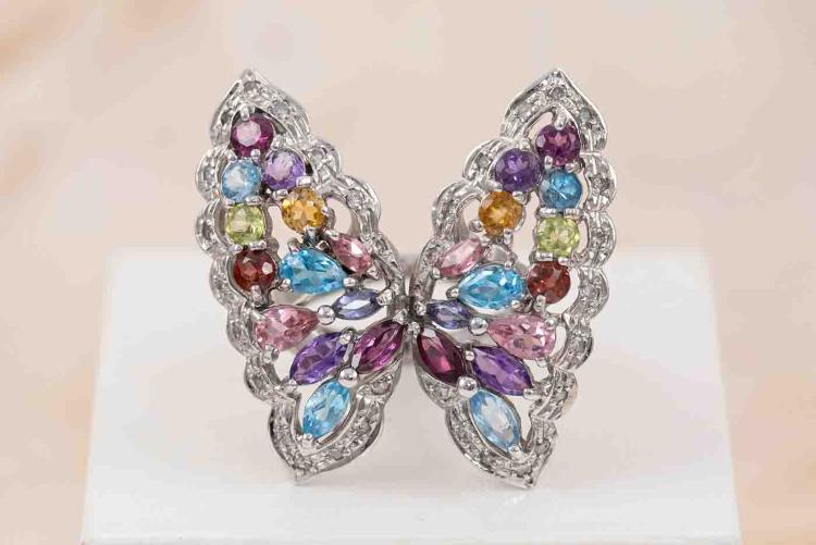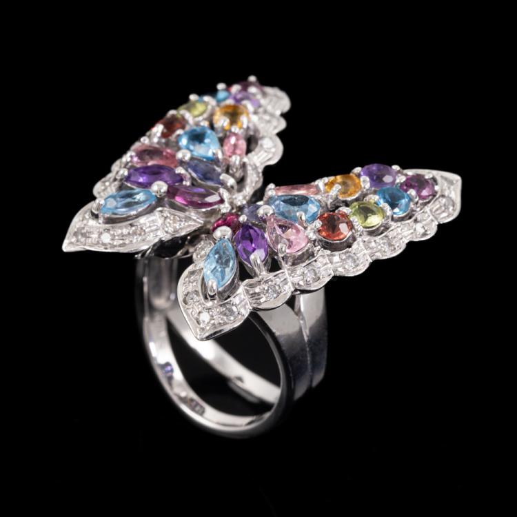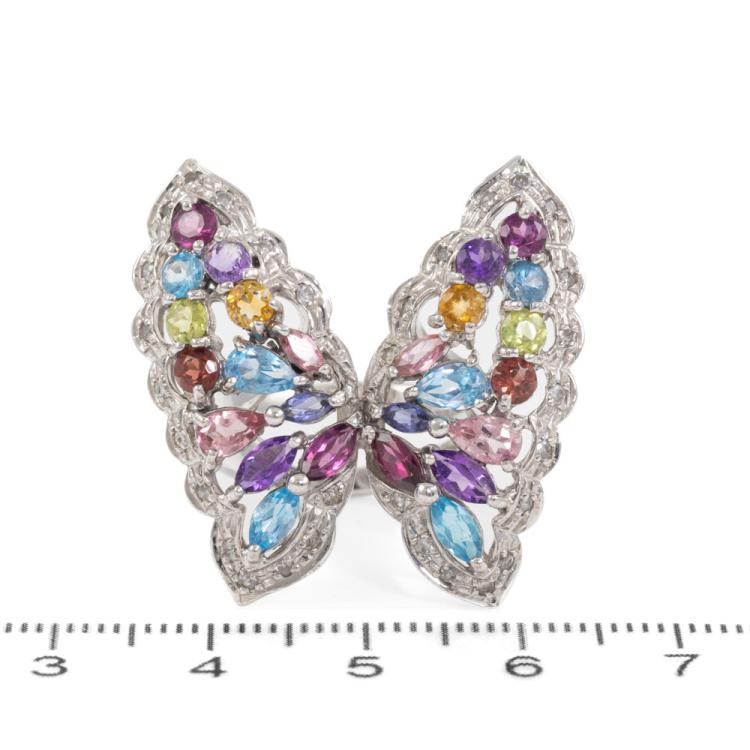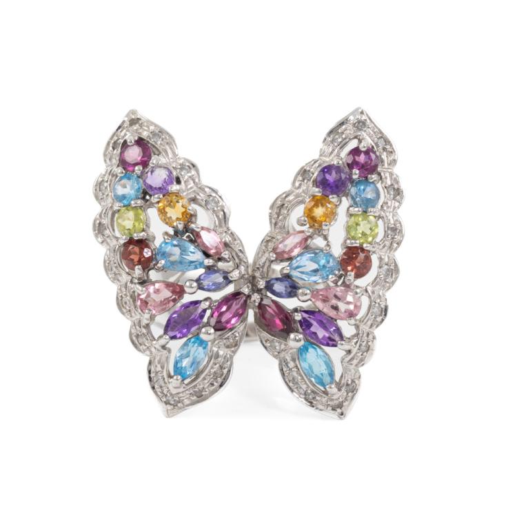 Butterfly ring with natural Gemstones (including blue Topaz, Amethyst, pink Tourmaline, Citrine, Tanzanite and Peridot) and round natural Diamonds totalling 0.40ct (Estimated grading: H-J SI-P1). 18ct white gold. Ring size M. Weight: 14.6g. Approximately size of Gemstone: round - 3.5mm, marquise - 4.3 x 2.1mm & 4.8 x 2.5mm, pear shape - 5.4 x 3.2mm. (Pre-owned)