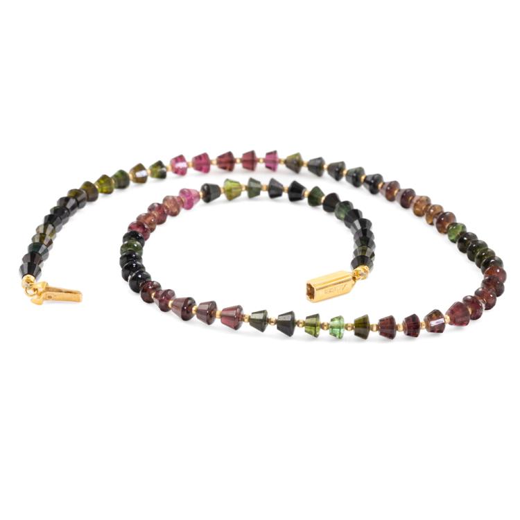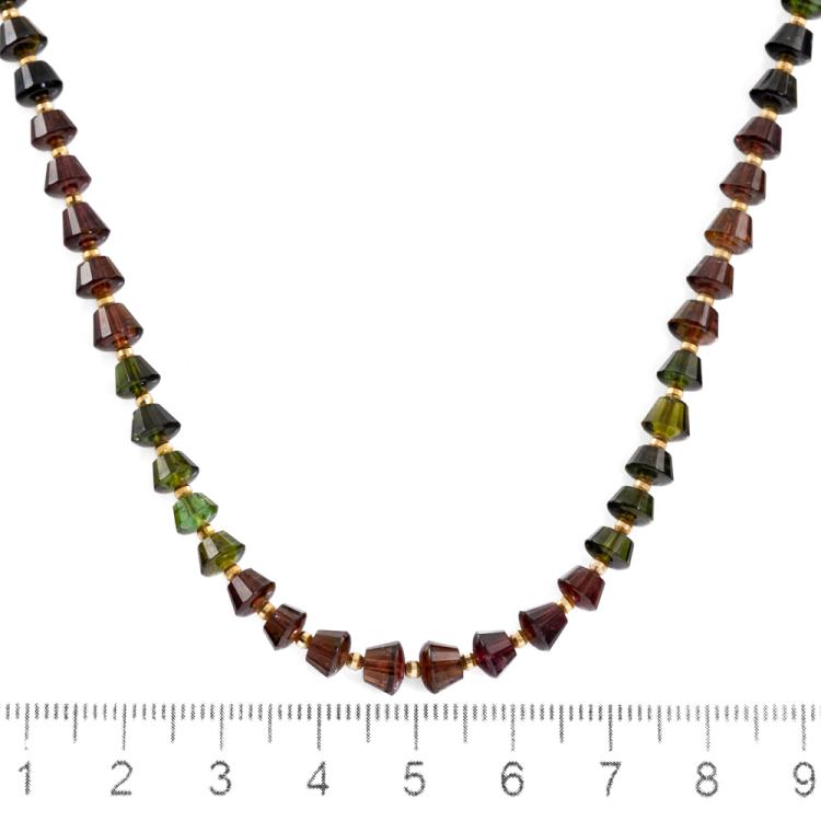 Tourmaline necklace with multi-coloured Tourmaline beads of size 5.6 x 4.6mm - 5.1 x 4.1mm. 18ct yellow gold. Length: 44cm. Weight: 16.4g. (Pre-owned)
