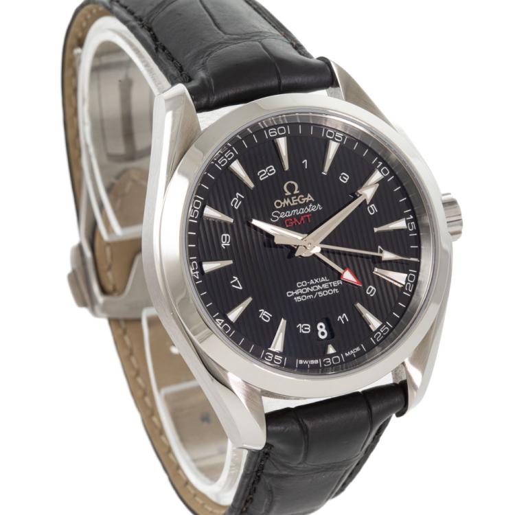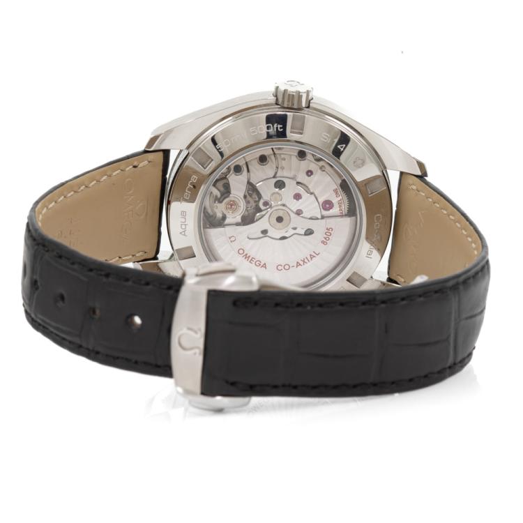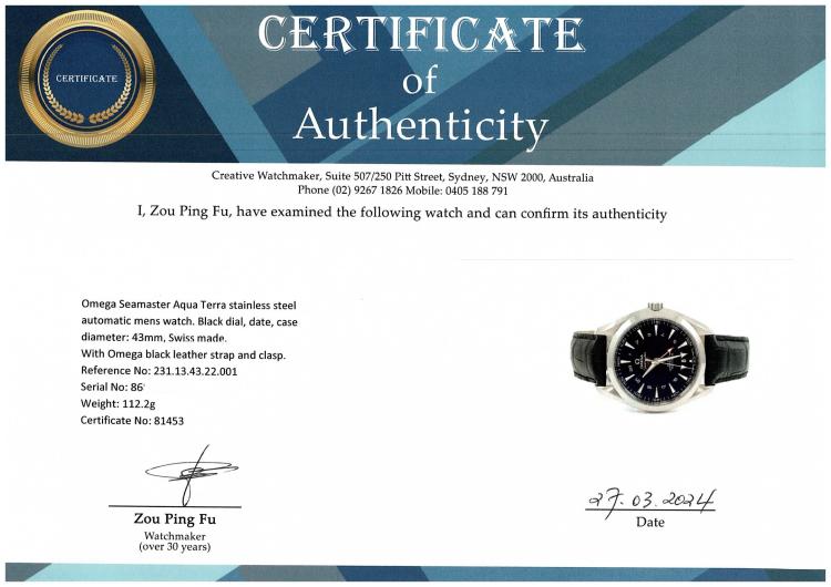 Omega Seamaster Aqua Terra stainless steel automatic mens watch. Black dial, date, case diameter: 43mm, adjustable max wrist size: 19cm, Swiss made. Ref# 231.13.43.22.001. With Omega black leather strap and clasp. With Certificate of Authenticity, Omega International Warranty dated 30/05/2021, Pictograms card and Omega box. Balance of 5 year Omega manufacturer warranty applies. (Pre-owned)
