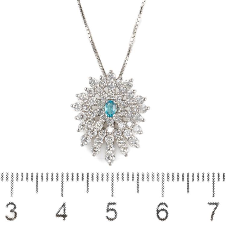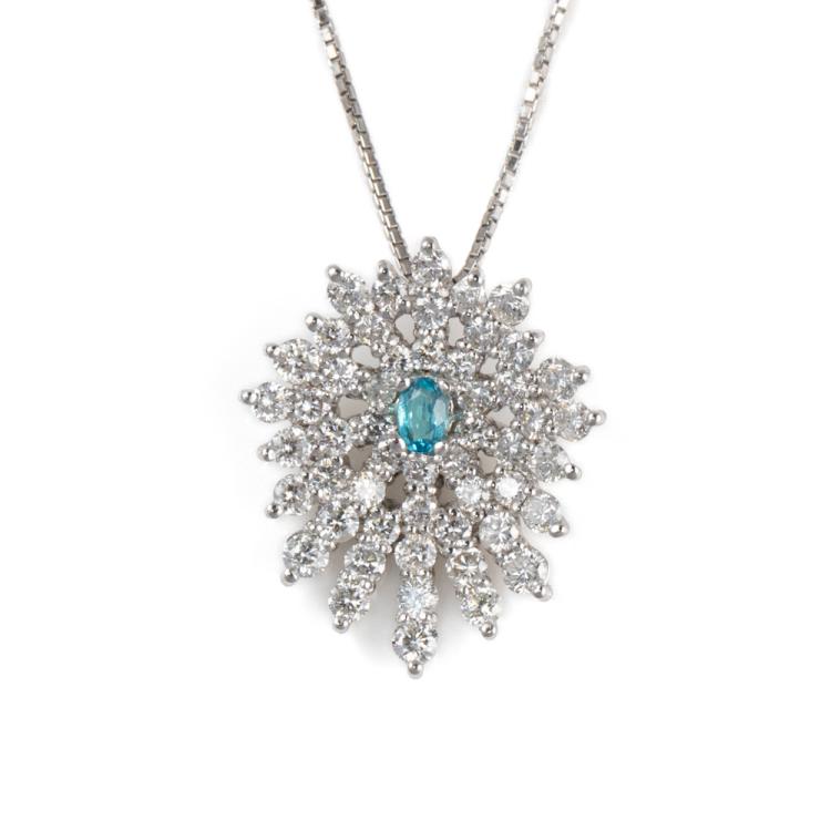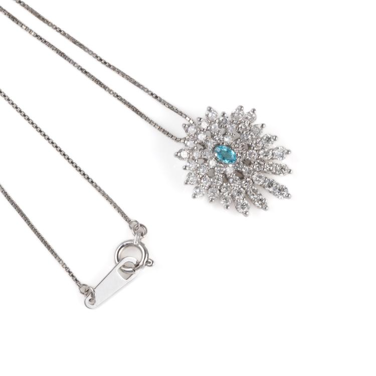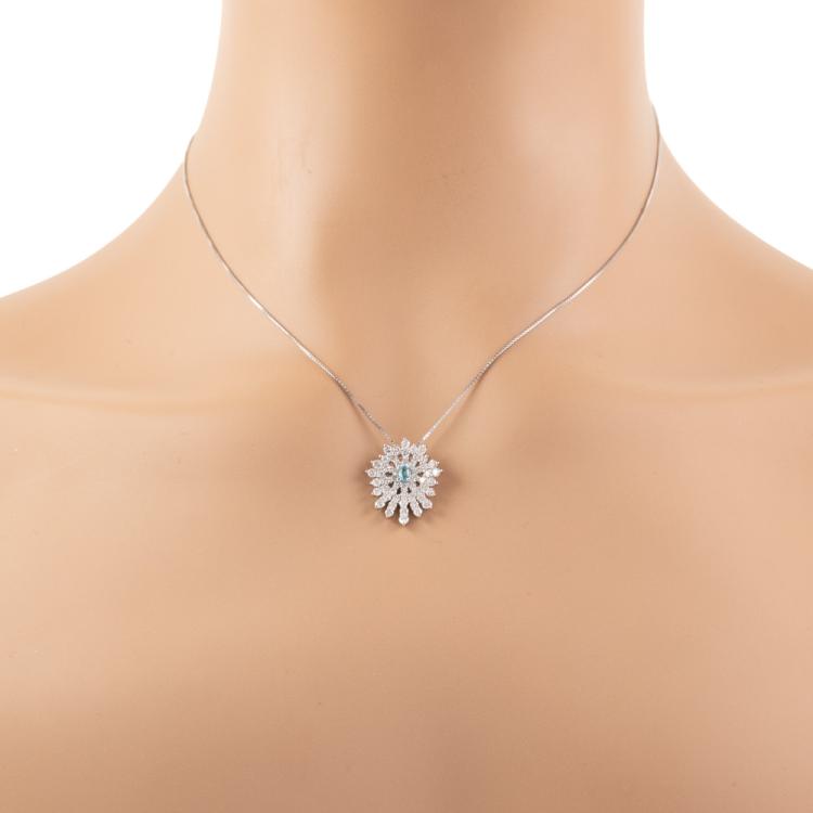 Tourmaline and Diamond pendant with an oval natural Paraiba Tourmaline of 0.08ct and round natural Diamonds totalling 1.00ct (Estimated grading: G-J VS-SI). 18ct white gold with 40cm 18ct white gold chain. Weight: 5.0g. (Pre-owned)