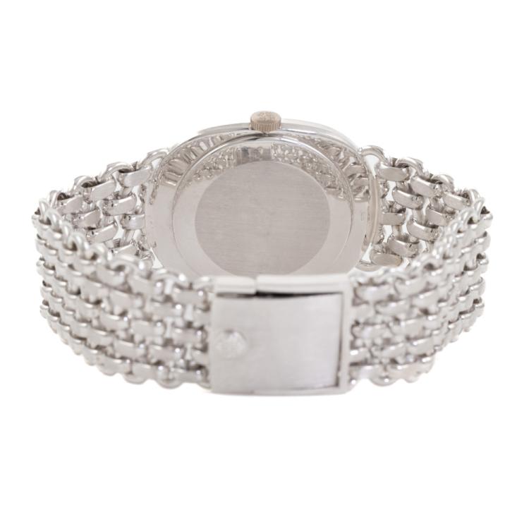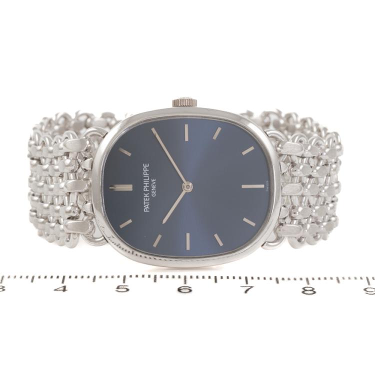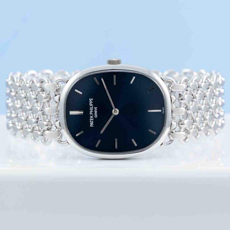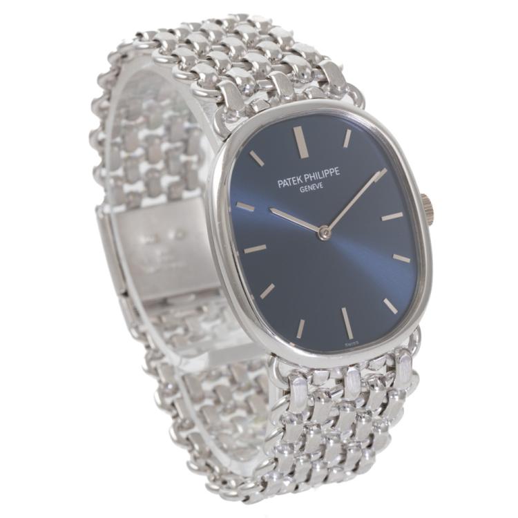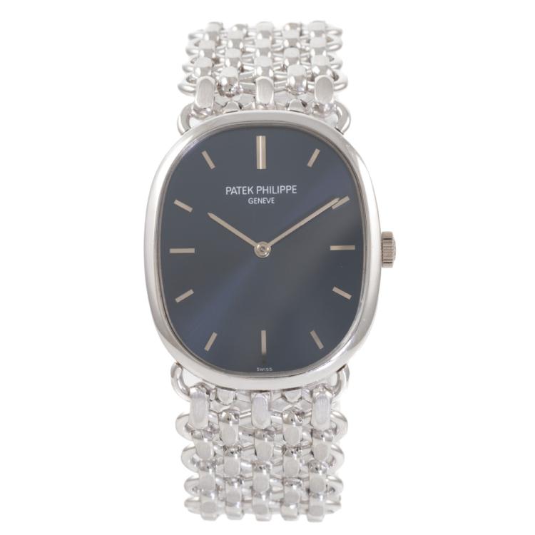 Patek Philippe Golden Ellipse 18ct white gold manual winding watch. Dark blue dial, case diameter: 32mm x 27mm, wrist size: 15.5cm, Swiss made. Ref# 3648/1G. With Patek Philippe 18ct white gold bracelet and clasp. With Certificate of Authenticity and Patek Philippe box. 3 month FSA warranty. (Pre-owned)