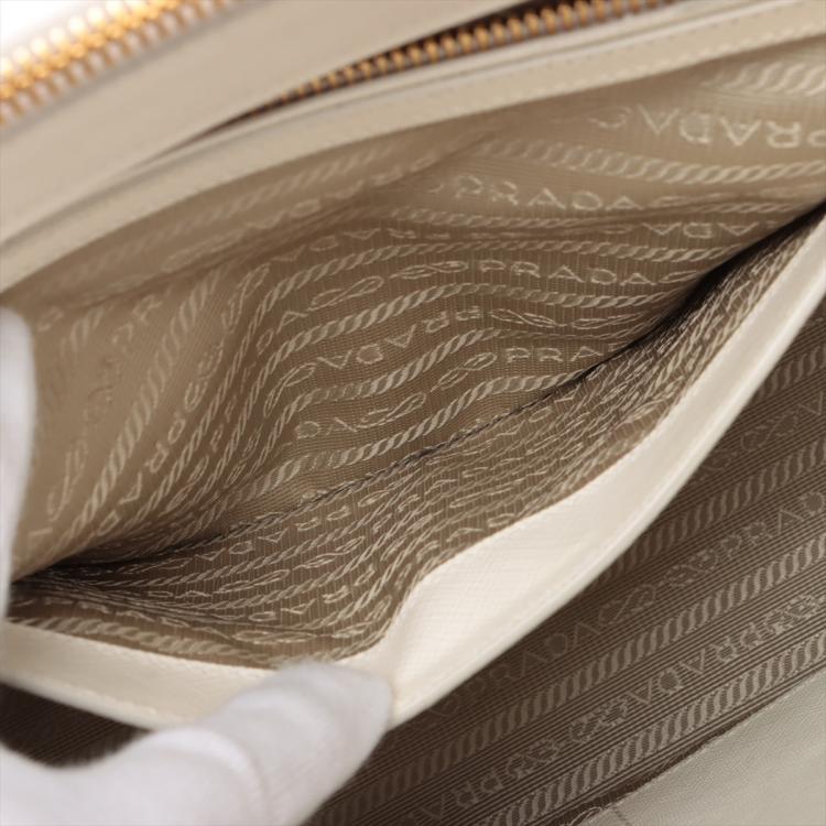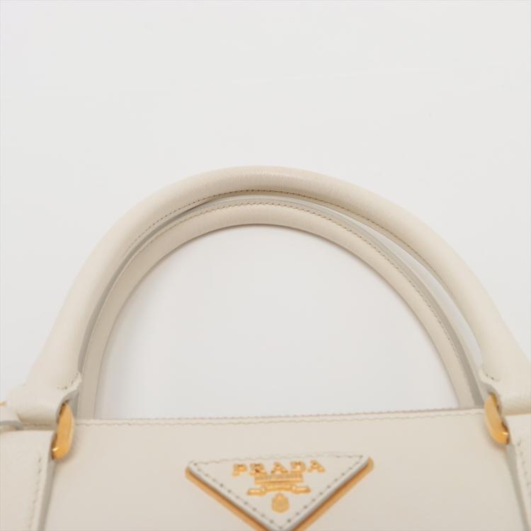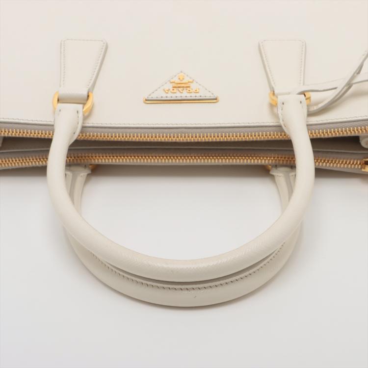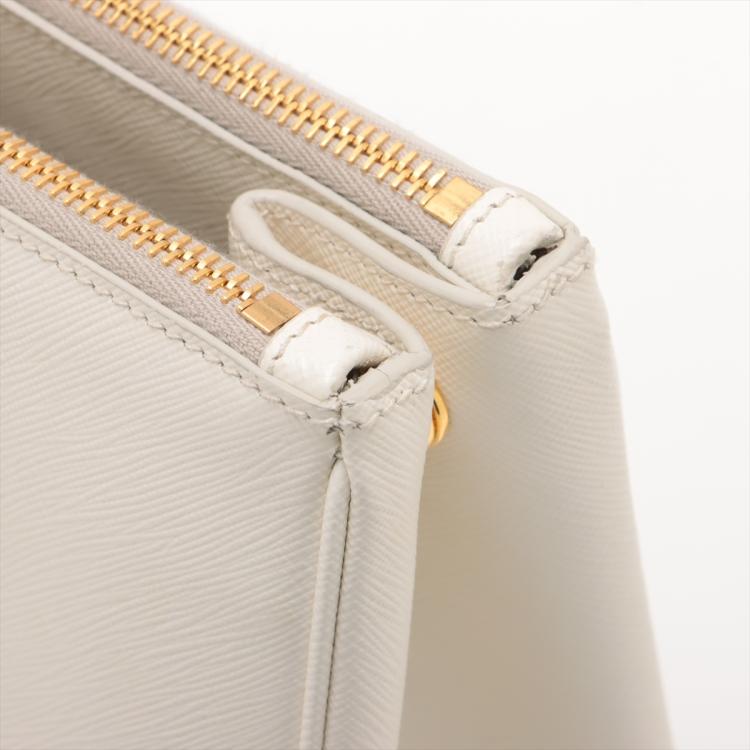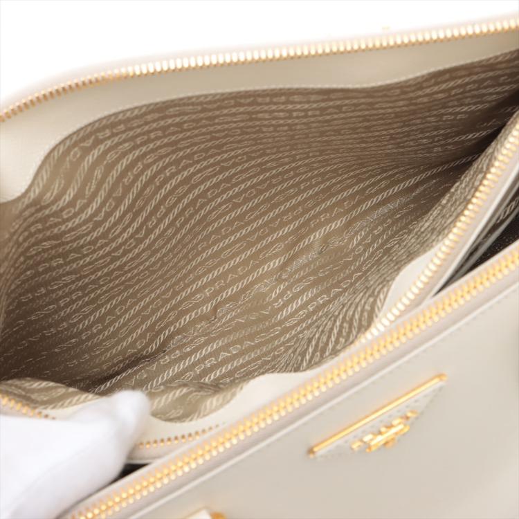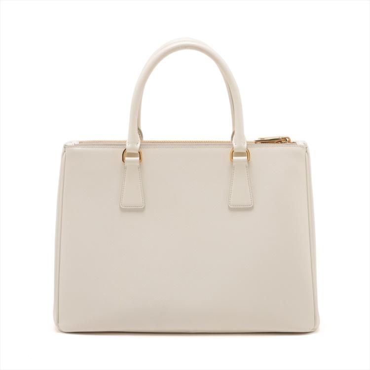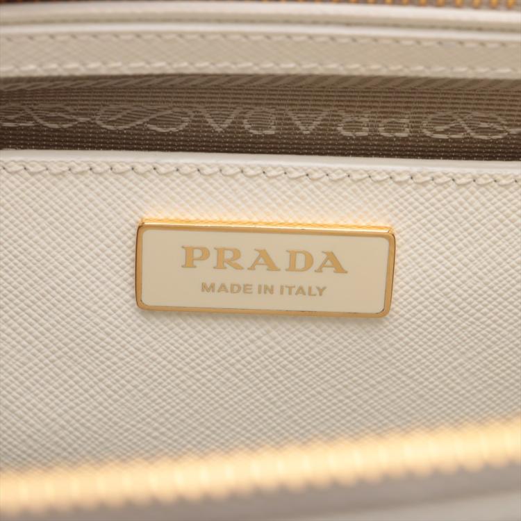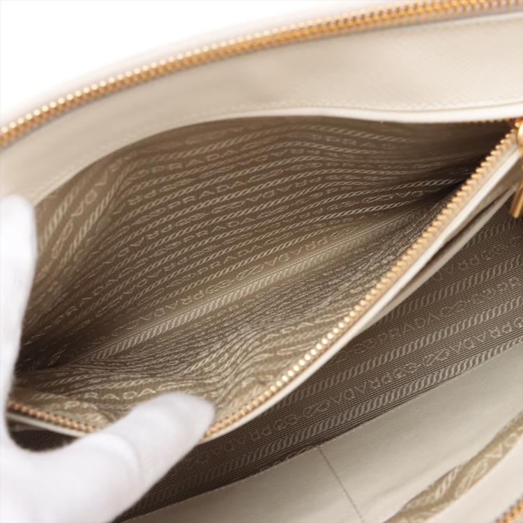 Prada large Galleria bag in cream white Saffiano leather. Featuring gold-tone hardware, leather handles, 2 external zipper compartments, metal lettering logo at front, snap closures on sides. The top opens to a logo-print nylon lining interior with pockets. Approximate dimensions: 33cm(base-L) x 22cm(H) x 13cm(D), 12cm handle drop and 60cm strap drop. Accompanied by Prada certificate card (1/2/19), keyring and dust bags. With Entrupy Certificate of Authenticity. (Pre-owned)