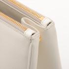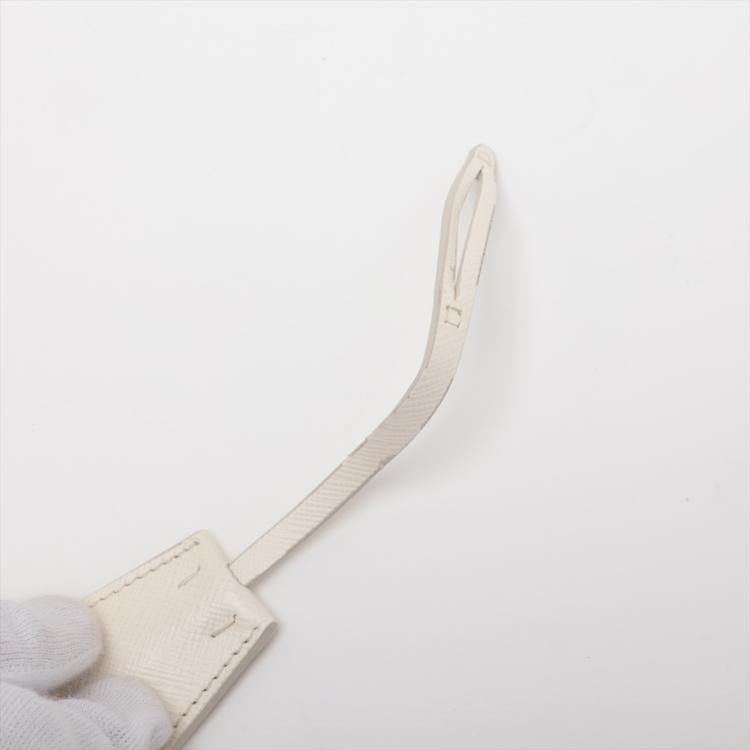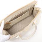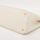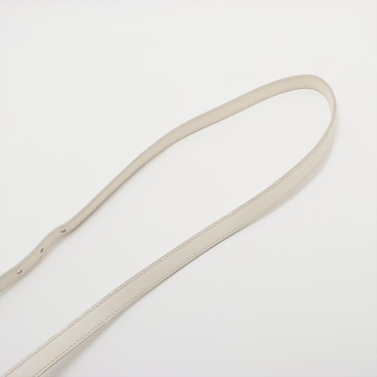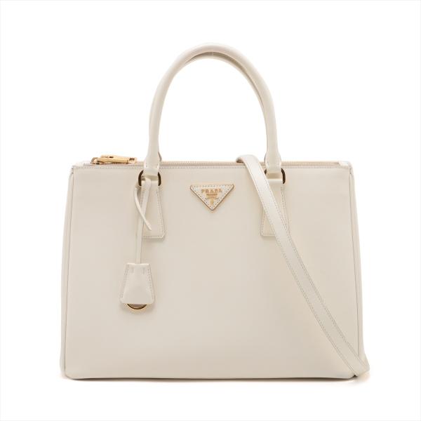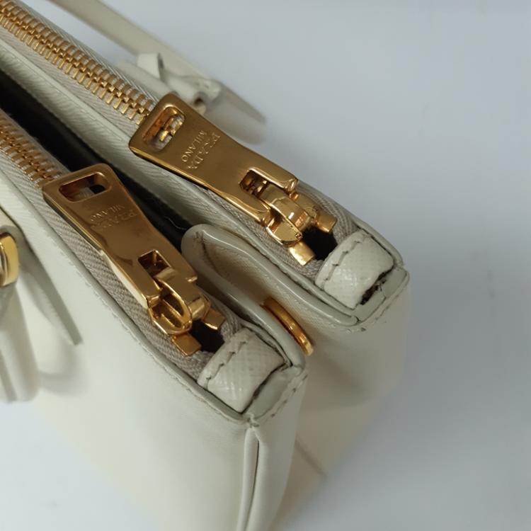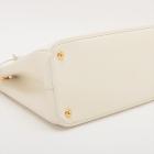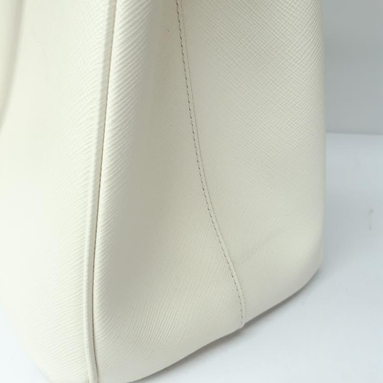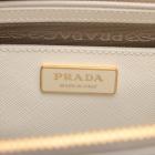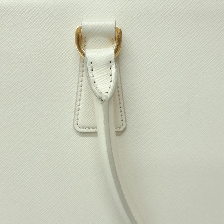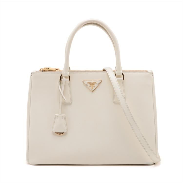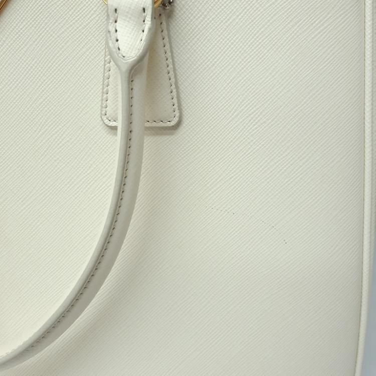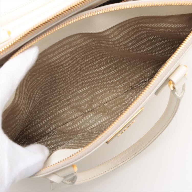 Prada large Galleria bag in cream white Saffiano leather. Featuring gold-tone hardware, leather handles, 2 external zipper compartments, metal lettering logo at front, snap closures on sides. The top opens to a logo-print nylon lining interior with pockets. Approximate dimensions: 33cm(base-L) x 22cm(H) x 13cm(D), 12cm handle drop and 60cm strap drop. Accompanied by Prada certificate card (1/2/19), keyring and dust bags. With Entrupy Certificate of Authenticity. (Pre-owned)