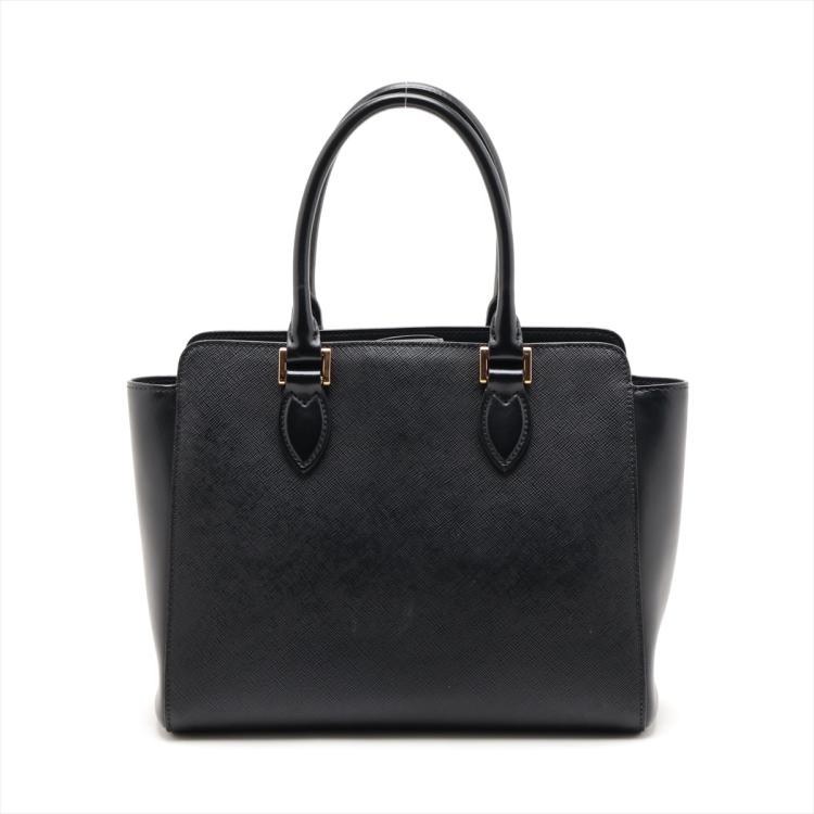 Prada tote bag in black Saffiano soft calfskin leather. Featuring rolled top handles, gold tone hardware, logo details at front. The top with magnetic button closure opens to a logo Jacquard nylon lining interior with zipper and patch pockets. Approximate dimensions: 26cm(W) x 21cm(H) x 10cm(D), 13cm handle drop, 54cm shoulder strap drop. Accompanied by a leather crochet & keyring, Prada certificate card and a dust bag. With Entrupy Certificate of Authenticity. (Pre-owned)