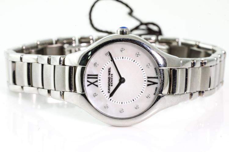 Raymond Weil Noemia stainless steel quartz ladies watch. Mother of Pearl dial, case diameter: 27mm, wrist size: 17.5cm, Swiss made. Ref# 5127-ST-00985. With Raymond Weil stainless steel bracelet and clasp. With Raymond Weil International Guarantee card and Raymond Weil box. 12 month warranty (As new, Note: minor scratches on case and bracelet due to being display stock)