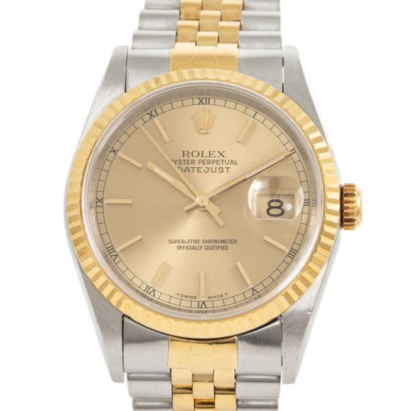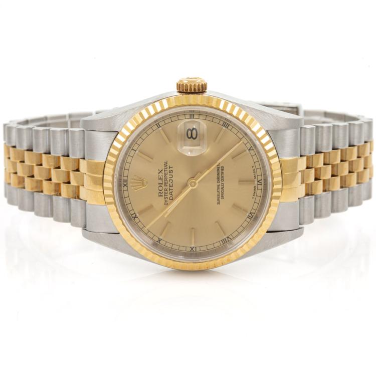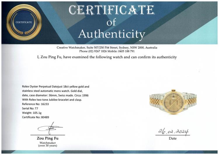 Rolex Oyster Perpetual Datejust 18ct yellow gold and stainless steel automatic mens watch. Gold dial, date, case diameter: 36mm, wrist size: 19.5cm, Swiss made. Ref# 16233. Circa: 1996. With Rolex two tone Jubilee bracelet and clasp. With Certificate of Authenticity, Rolex Guarantee Certificate dated 19/10/1998 and Rolex box with Rolex gift bag. 3 month FSA warranty (Pre-owned)