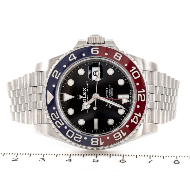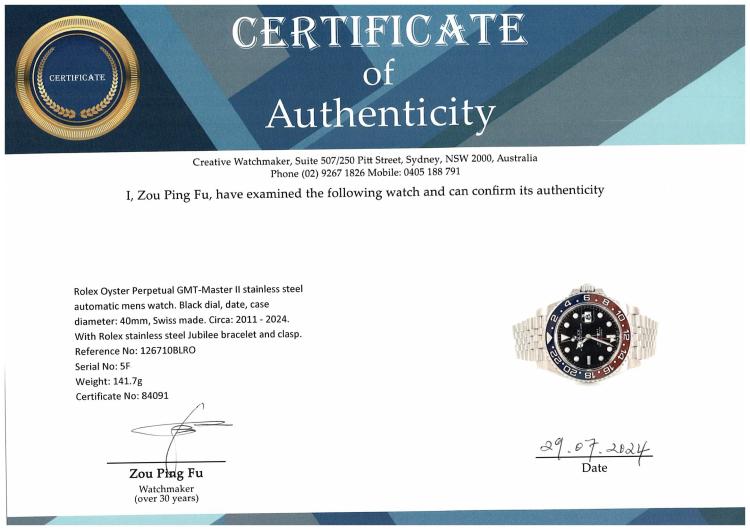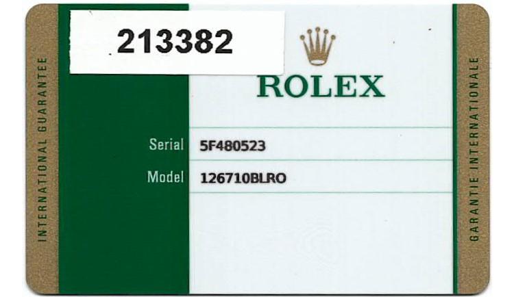 Rolex Oyster Perpetual GMT-Master II stainless steel automatic mens watch. Black dial, date, case diameter: 40mm, wrist size: 18cm, Swiss made. Ref# 126710BLRO. Circa: 2011 - 2024. With Rolex stainless steel Jubilee bracelet and clasp. With Certificate of Authenticity, Rolex International Guarantee card dated 01/19/2020 and Rolex box. Balance of 5 year Rolex manufacturer warranty applies. (Pre-owned)