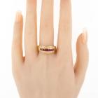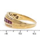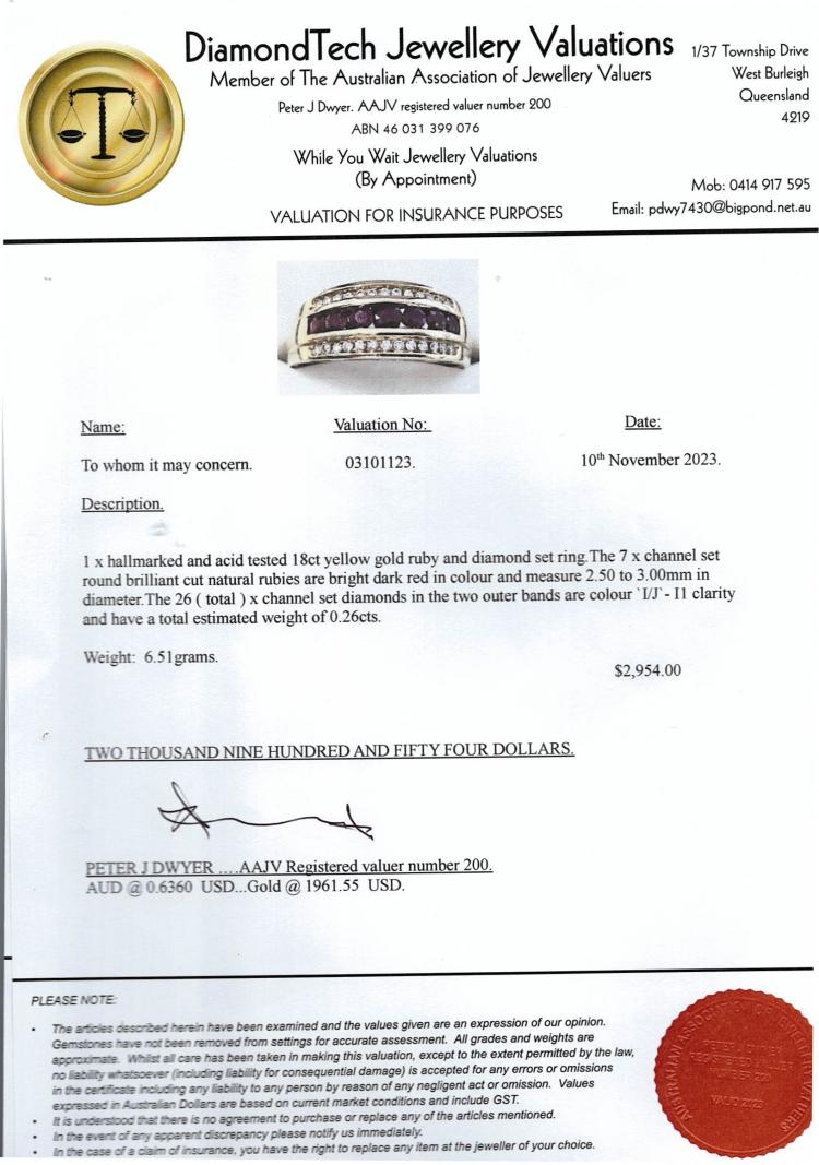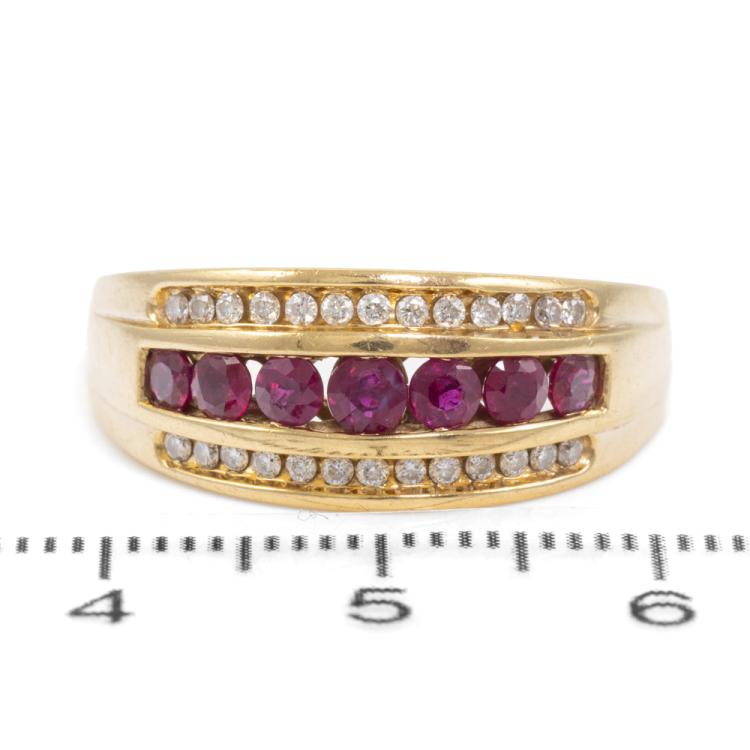 Ruby and Diamond ring with round natural Rubies totalling approximately 0.70ct and round natural Diamonds totalling 0.26ct. 18ct yellow gold. Ring size S. Band width: 1.4mm-5.7mm. Weight: 6.5g. With Valuation dated 10/11/23. (Pre-owned)