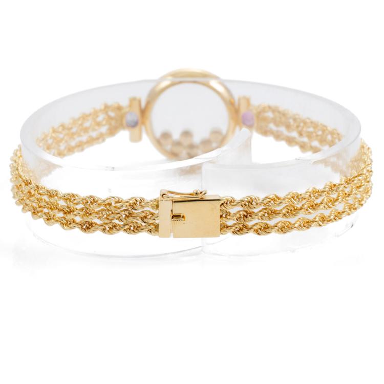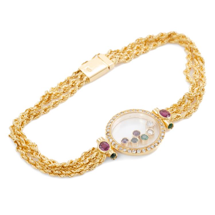 Ruby, Emerald, Diamond bracelet with round & oval shape Natural Rubies totalling approximately 0.35cts, round Natural Emerald totalling approximately 0.12cts, and round Diamonds totalling approximately 0.25cts. 18ct yellow gold. Length: 17cm. Weight: 13.6g. (Pre-owned)