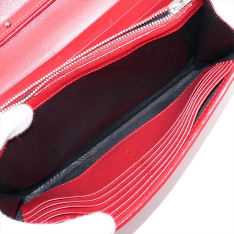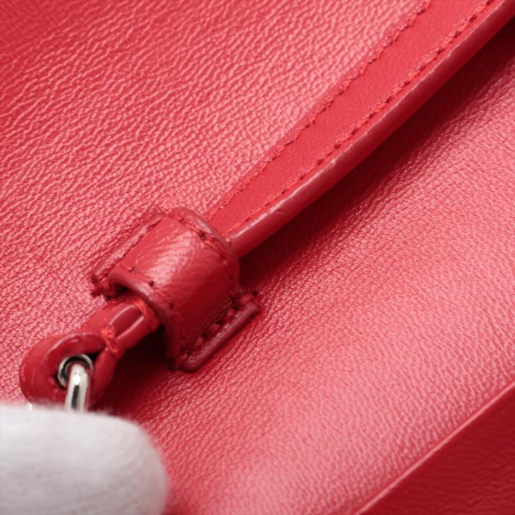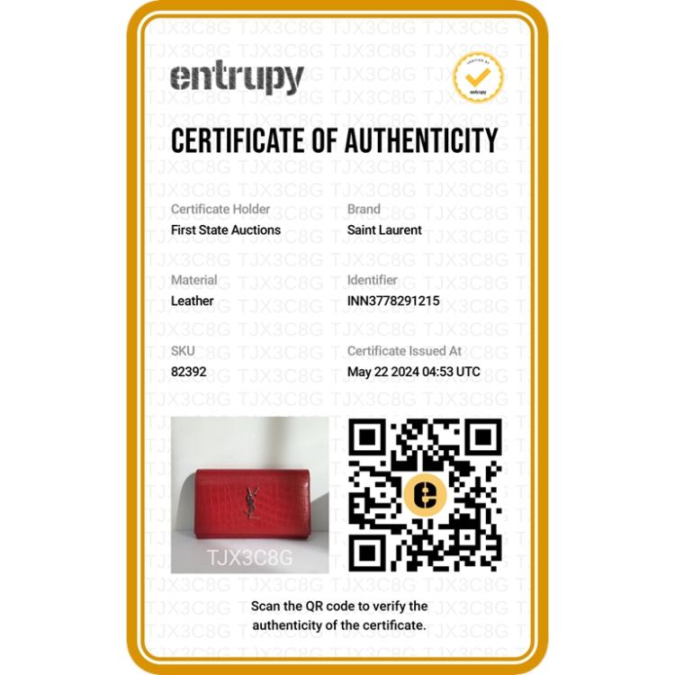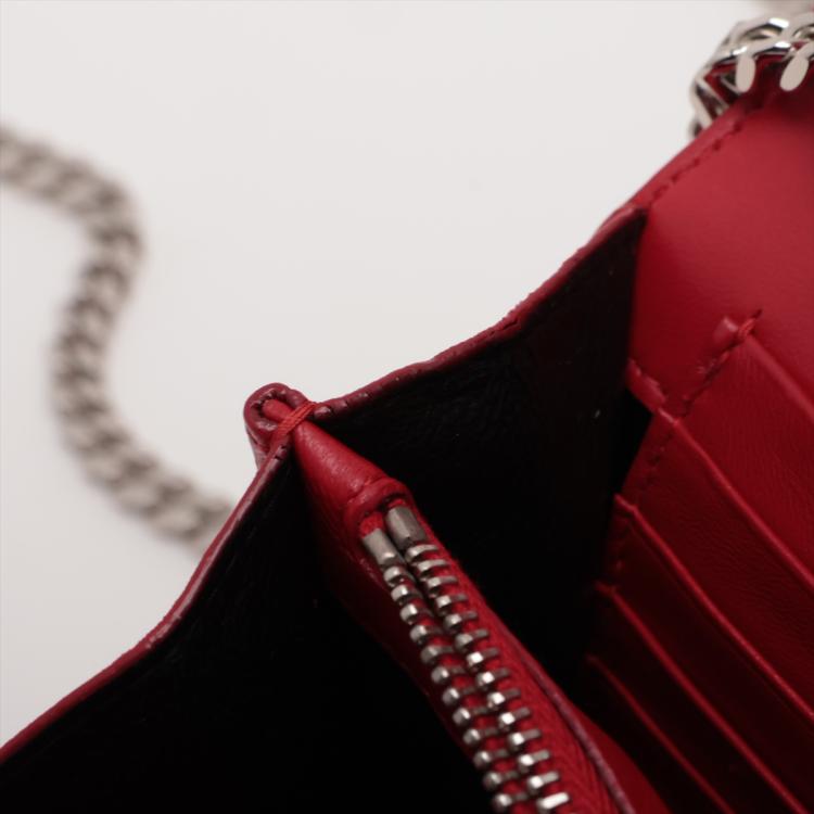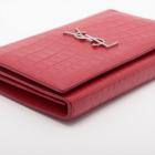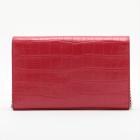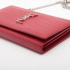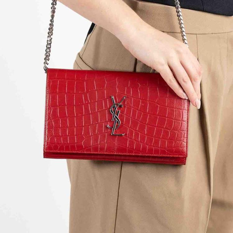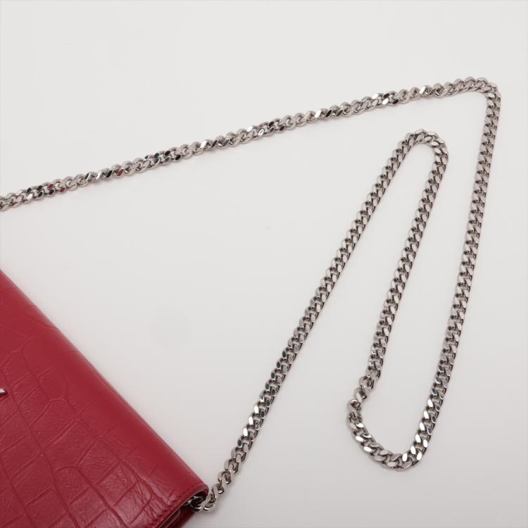 Saint Laurent wallet on chain bag in matt Moc Croc embossed leather in red. Featuring silver tone hardware, frontal flap with silver "YSL" logo detail and snap button closure. The flap opens to a leather lining interior with card slots and a zipper pocket in the middle. Approximate dimensions: 22cm(W) x 14cm(H) x 3cm(D), 48.5cm shoulder chain drop. Accompanied by a YSL info booklets. With Entrupy Certificate of Authenticity.