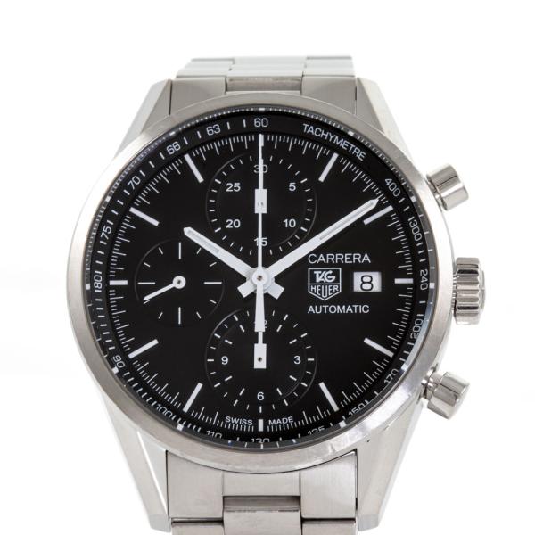 TAG Heuer Carrera stainless steel automatic mens watch. Black dial, date, case diameter: 39mm, wrist size: 17.5cm, Swiss made. Ref# CAR2210. With TAG Heuer stainless steel bracelet and clasp. With Certificate of Authenticity. 3 month FSA warranty. (Pre-owned)