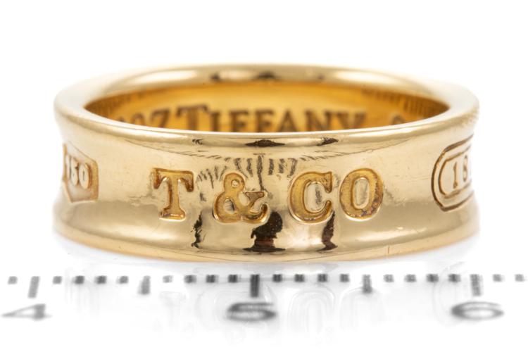 Tiffany & Co. 1837 ring. 18ct yellow gold. Ring size M - ring resizing is not recommended. Circa 1997. Width: 6.2mm. Weight: 7.2g. (Pre-owned)