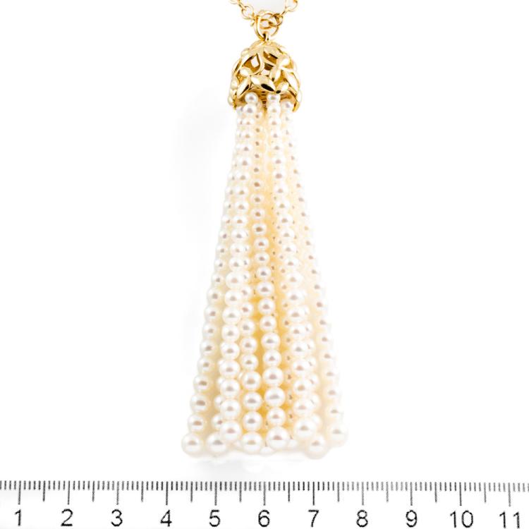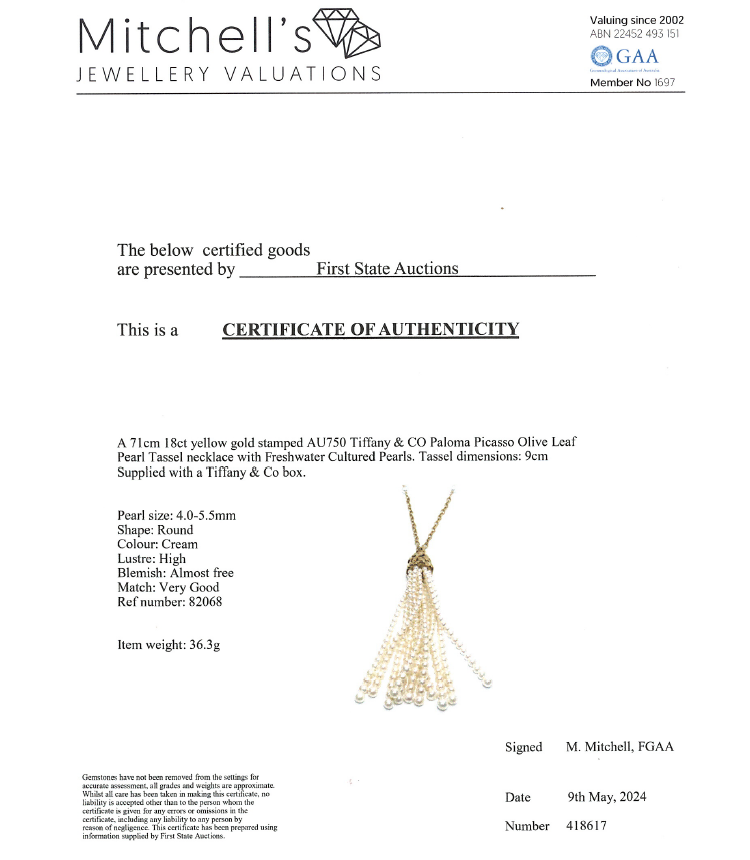 Tiffany & Co. Paloma Picasso Olive Leaf Pearl Tassel Necklace with Freshwater Cultured Pearls of 4mm - 5.5mm. 18ct yellow gold with 71cm Tiffany & Co 18ct yellow gold chain. Tassel length: 9cm. Weight: 36.3g. With Tiffany & Co pouch. With Certificate #418617. (Pre-owned)