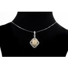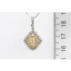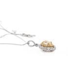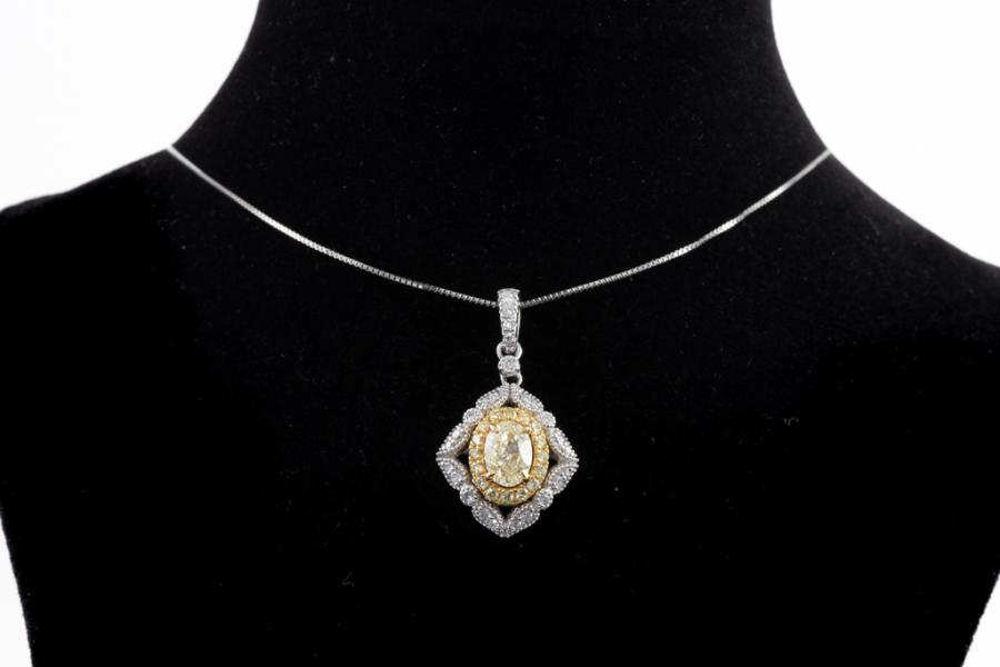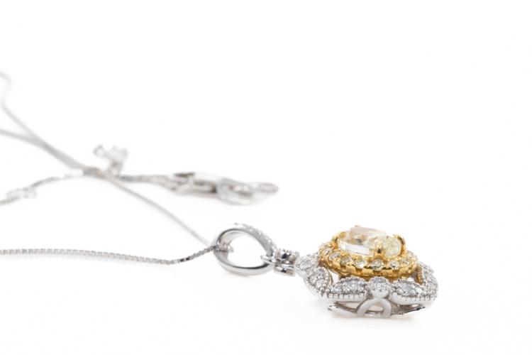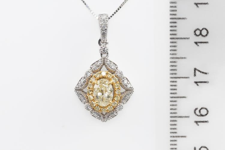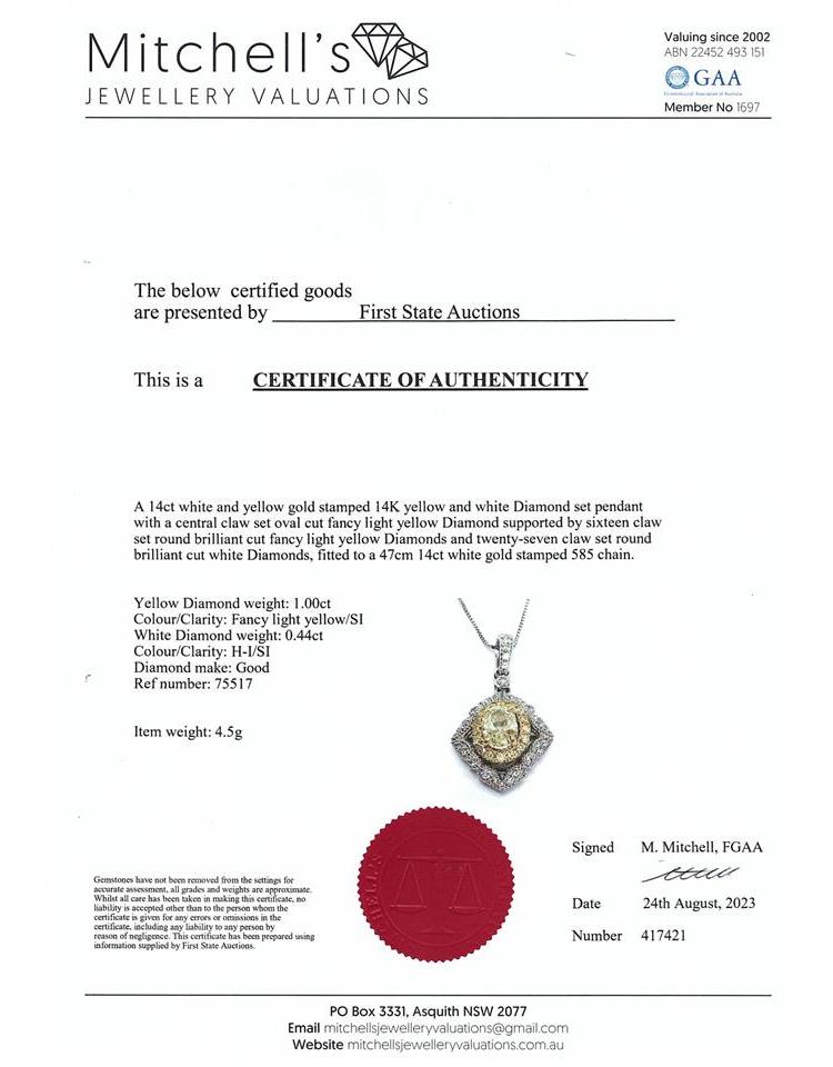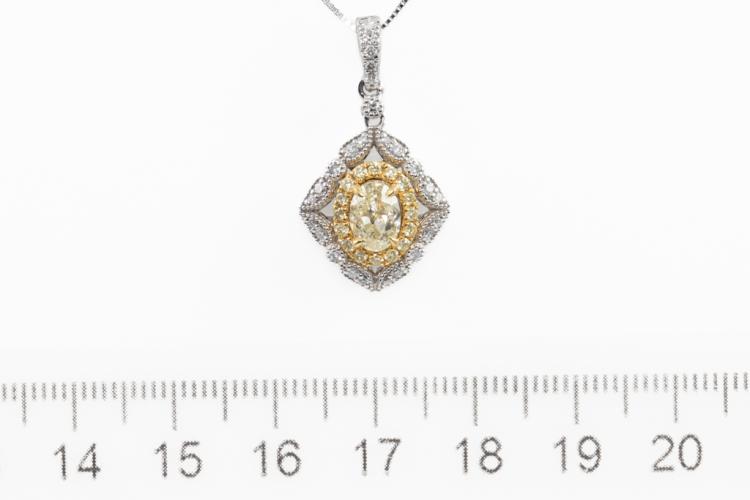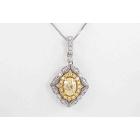 Diamond pendant with oval & round natural Yellow Diamonds totalling 1.00ct (Estimated grading: Fancy Light Yellow SI) and remaining round natural Diamonds totalling 0.44ct (Estimated grading: H-I SI). 14ct yellow and white gold with 47cm 18ct white gold adjustable chain. Weight: 4.5g. With Certificate #417421. (As new)