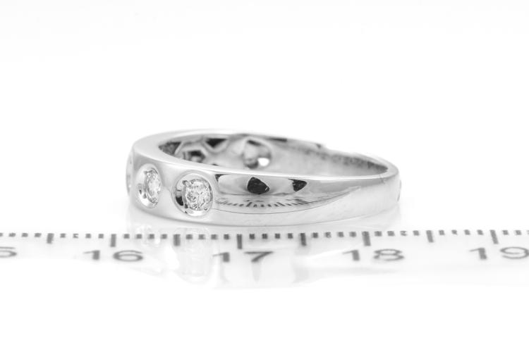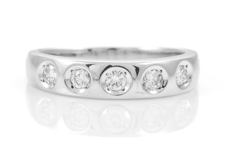 Diamond ring with 5 round natural Diamonds totalling 0.31ct (Estimated grading: G VS-SI). 18ct white gold. Ring size Q 1/4. Weight: 5.5g. (Pre-owned)