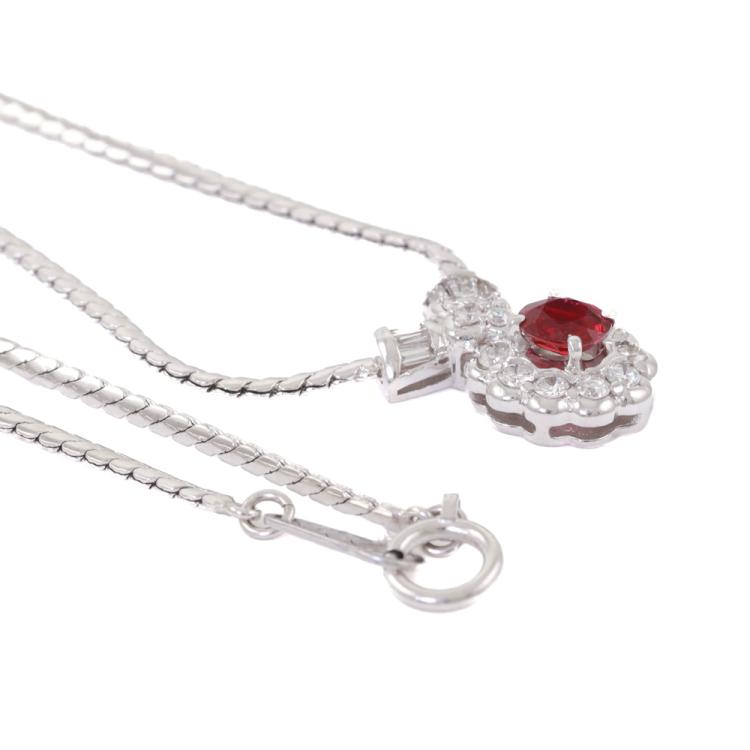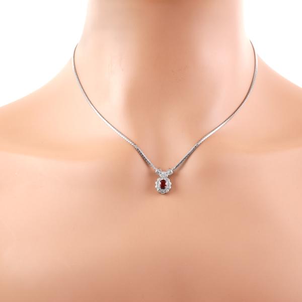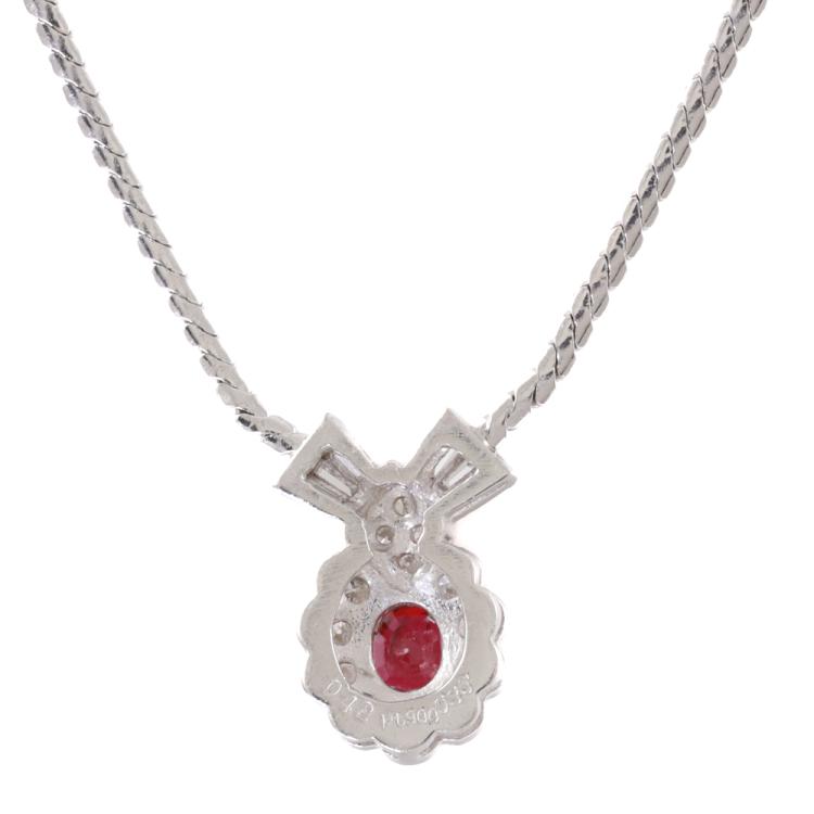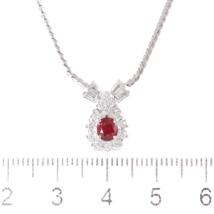 Ruby and Diamond necklace with round Natural Diamonds of 0.42ct and round Natural Diamonds totalling 0.35ct (Estimated Grading: H-I SI). Platinum - 900 with attached platinum-850 41.5cm chain . Weight: 9.5g. (Pre-owned)