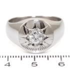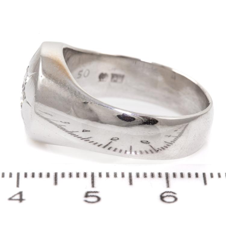Diamond mens ring with a round Diamond of 0.50ct (Estimated grading: H SI) Platinum - 850. Ring size V1/2. Band width: 5.8mm - 7.6mm. Weight: 21.8g. (Pre-owned)
