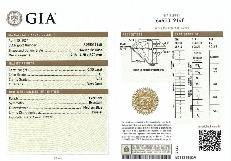 Diamond Studs with 2 round brilliant cut Natural Diamonds totalling 0.60ct (both with GIA summary reports graded as D VS1 # 7491173478, 6495019148). 18ct white gold. Weight: 0.9g. (New)