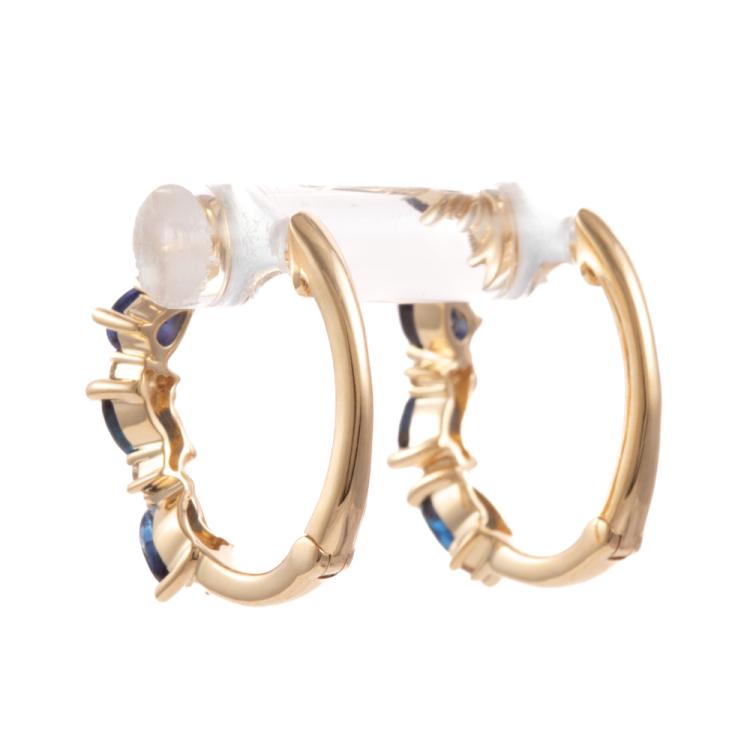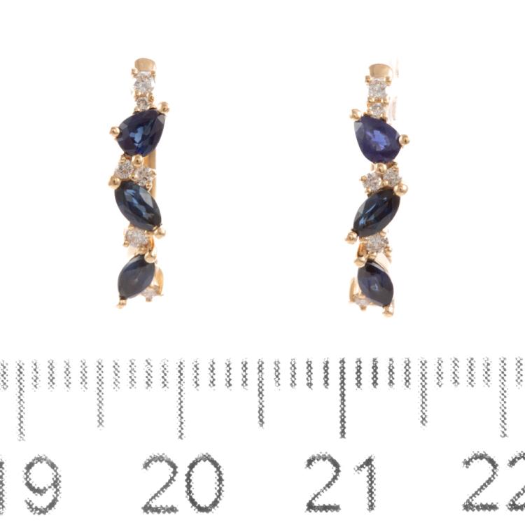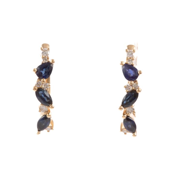 Sapphire and Diamond huggie earrings with marquise and pear shape Natural Sapphires totalling 0.74ct and round Natural Diamonds totalling 0.13ct. 18ct yellow gold. Weight: 2.8g. (New)
