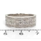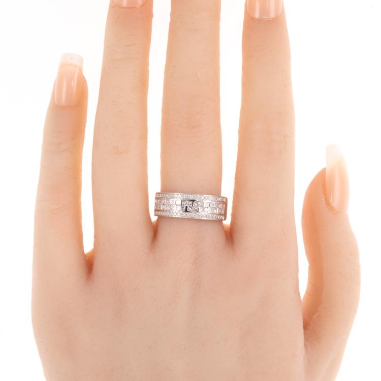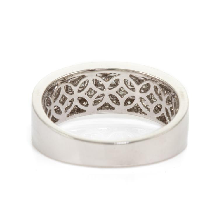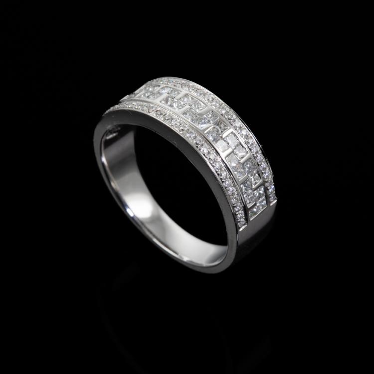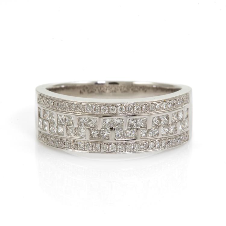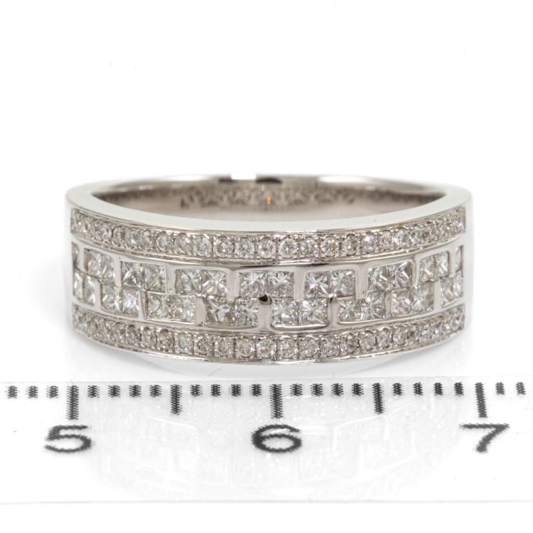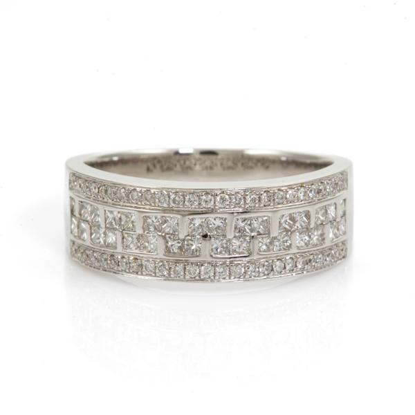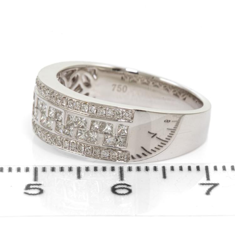 Diamond dress ring with round and princess cut Natural Diamonds totalling 0.75ct (Estimated grading: G-H SI). 18ct white gold. Ring size O. Band Width: 3.6mm-6.8mm. Weight: 5.8g. (As New)