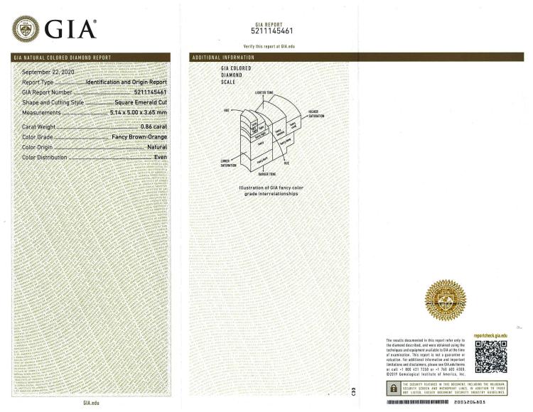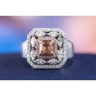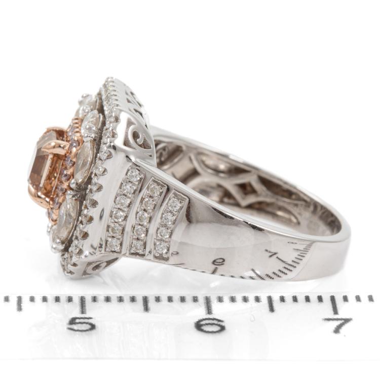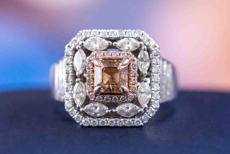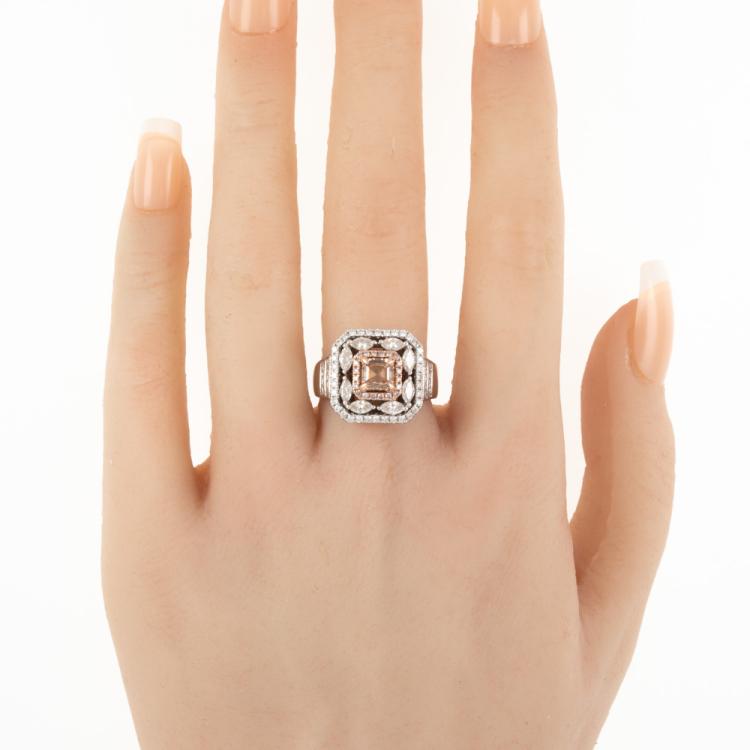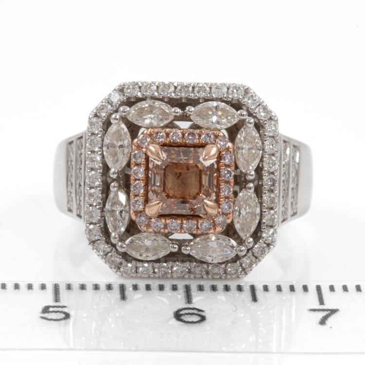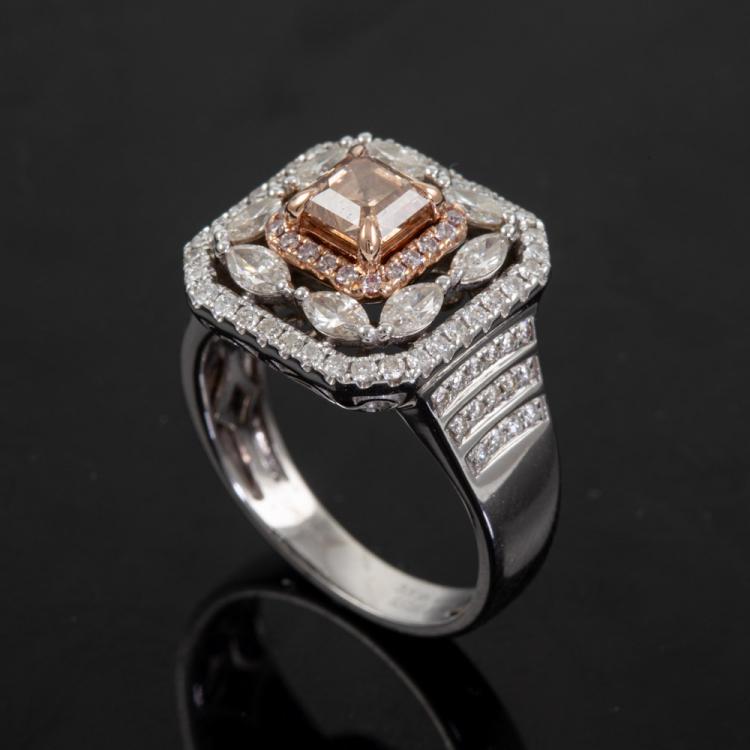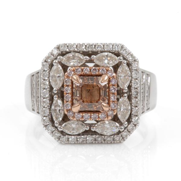 Diamond ring with a centre square emerald cut natural Diamond of 0.86ct (with GIA Report graded as Natural Fancy Brown-Orange Even #5211145461, FSA estimated clarity grade: P1) and remaining round & marquise cut natural pink & white Diamonds totalling 1.08ct (Estimated grading: G-H SI2). 14ct rose & white gold. Ring size N1/2. band width: 3.2mm-7.9mm. Weight: 7.6g. (Pre-owned)