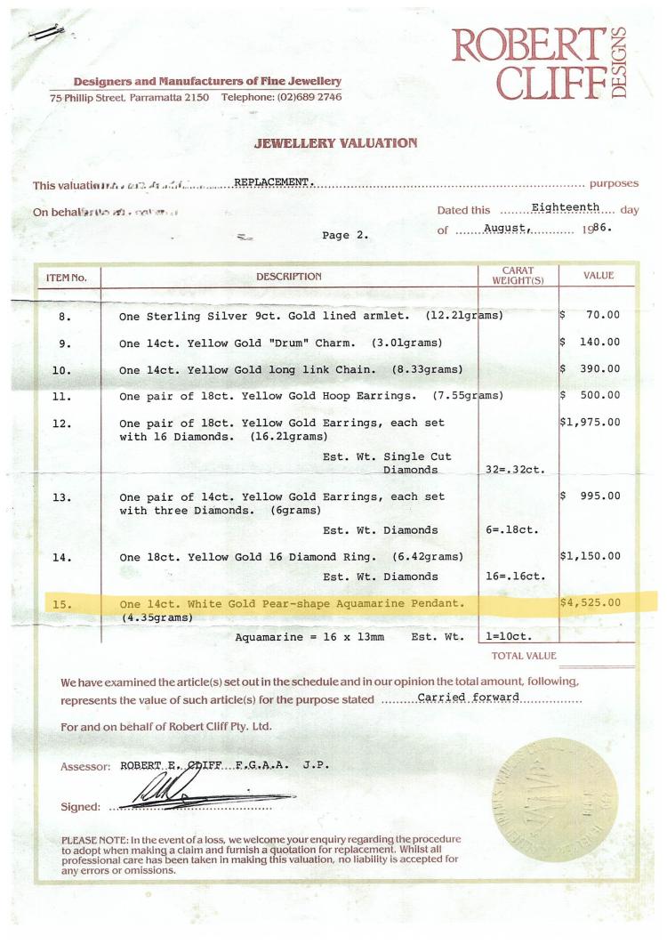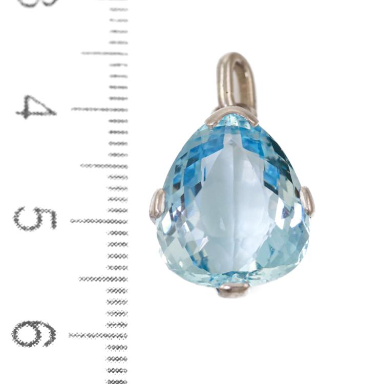 Aquamarine pendant with pear shape Natural Aquamarine of 10.00ct. 18ct white gold (XRF tested, not stamped. Copy of Valuation states 14ct). No chain provided. Weight: 4.4g. With a Copy of Valuation dated 18.08.1986. (Pre-owned)