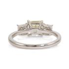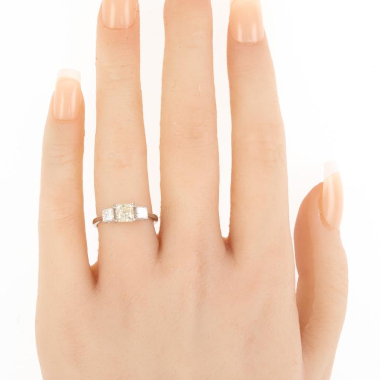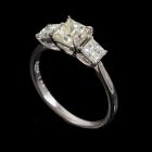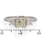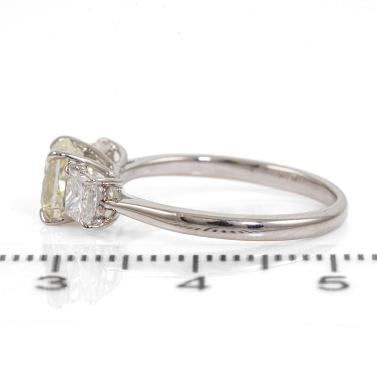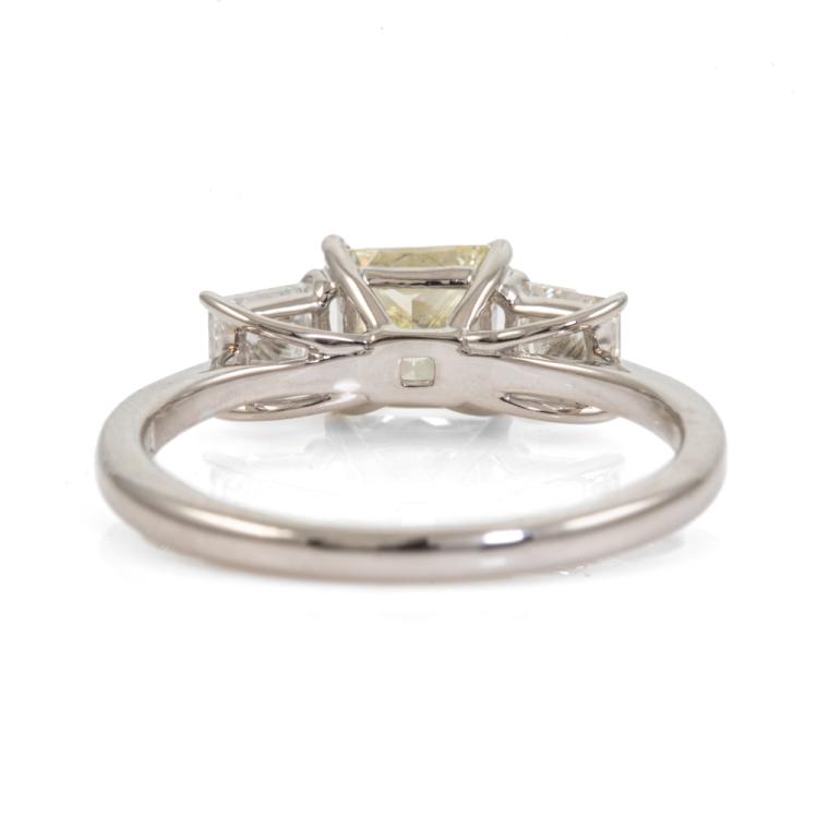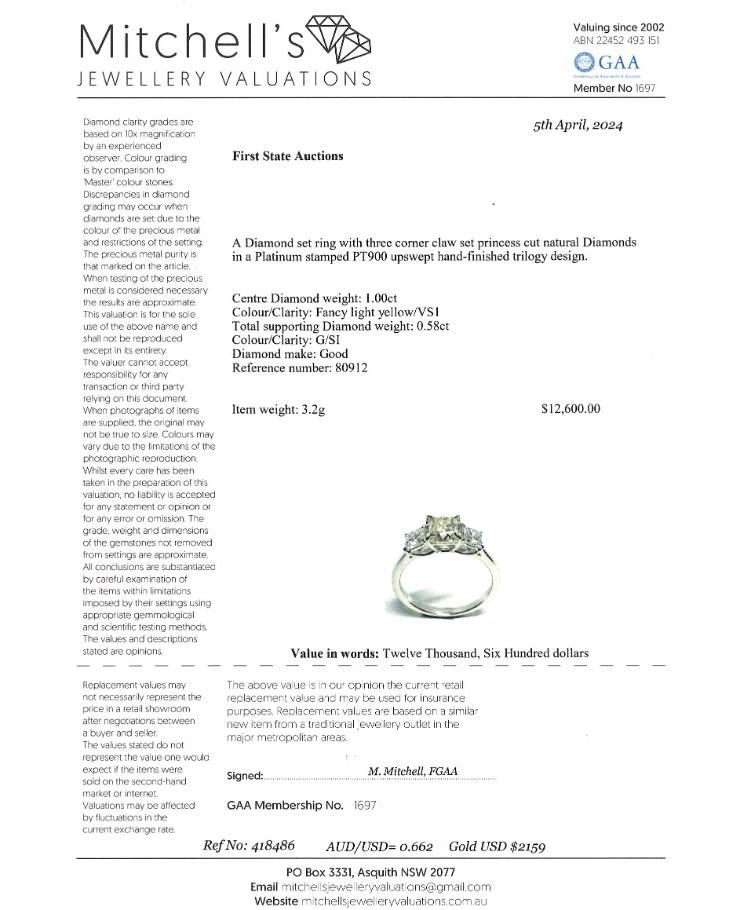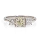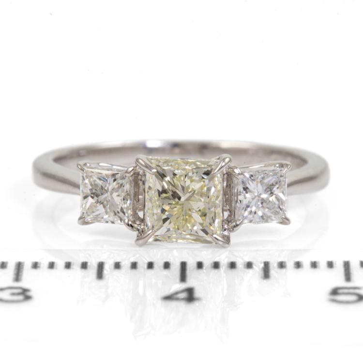 Diamond ring with centre princess cut natural Diamond of 1.00ct (Estimated grading: Fancy Light Yellow VS1) and 2 princess cut natural Diamonds totalling 0.58ct (Estimated grading: G SI). Platinum 900. Ring size K. Band width: 1.6mm - 1.3mm. Weight: 3.2g. With Valuation Certificate #418486 (Pre-owned)