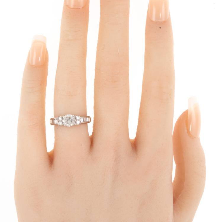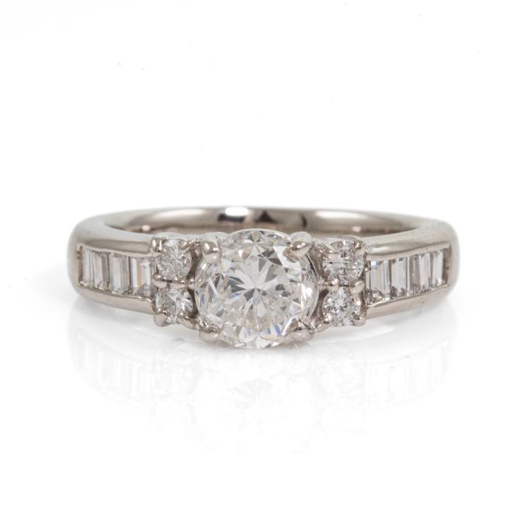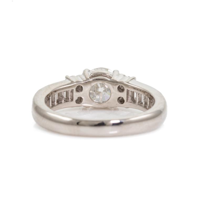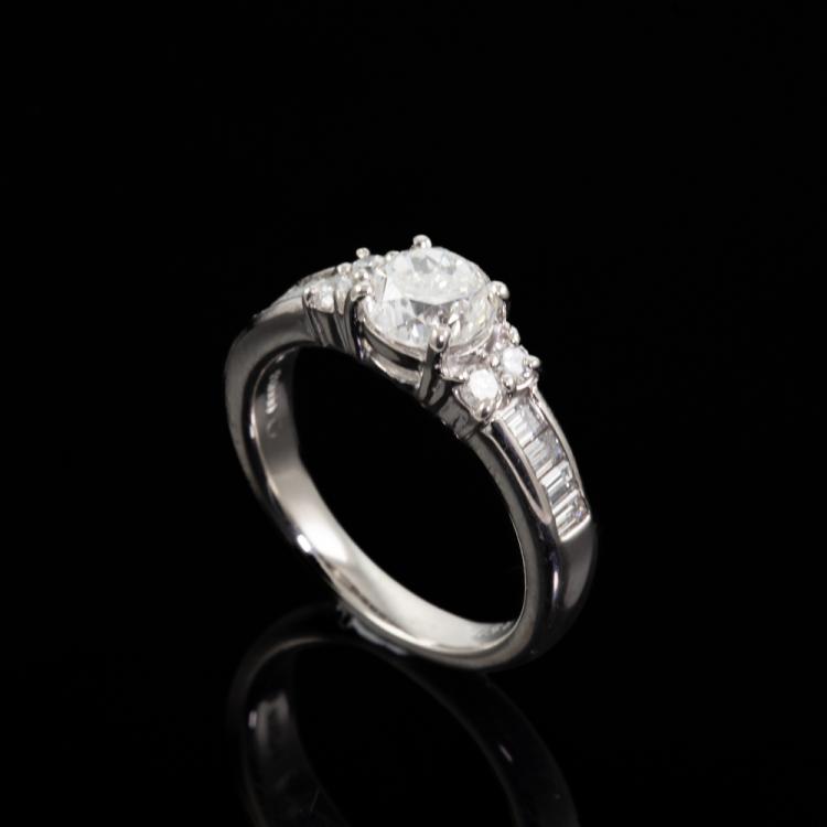 Diamond ring with centre round Natural Diamonds of 1.01ct (Estimated grading: H-I P1, note - Diamond with surface reaching inclusion) and round & baguette cut Diamonds totalling 0.50ct (Estimate grading: H-I SI). Platinum 1000. Ring size J. Band width 3.9mm - 2.6mm. Weight: 7.0g. With Valuation Certificate #418304. (Pre-owned)